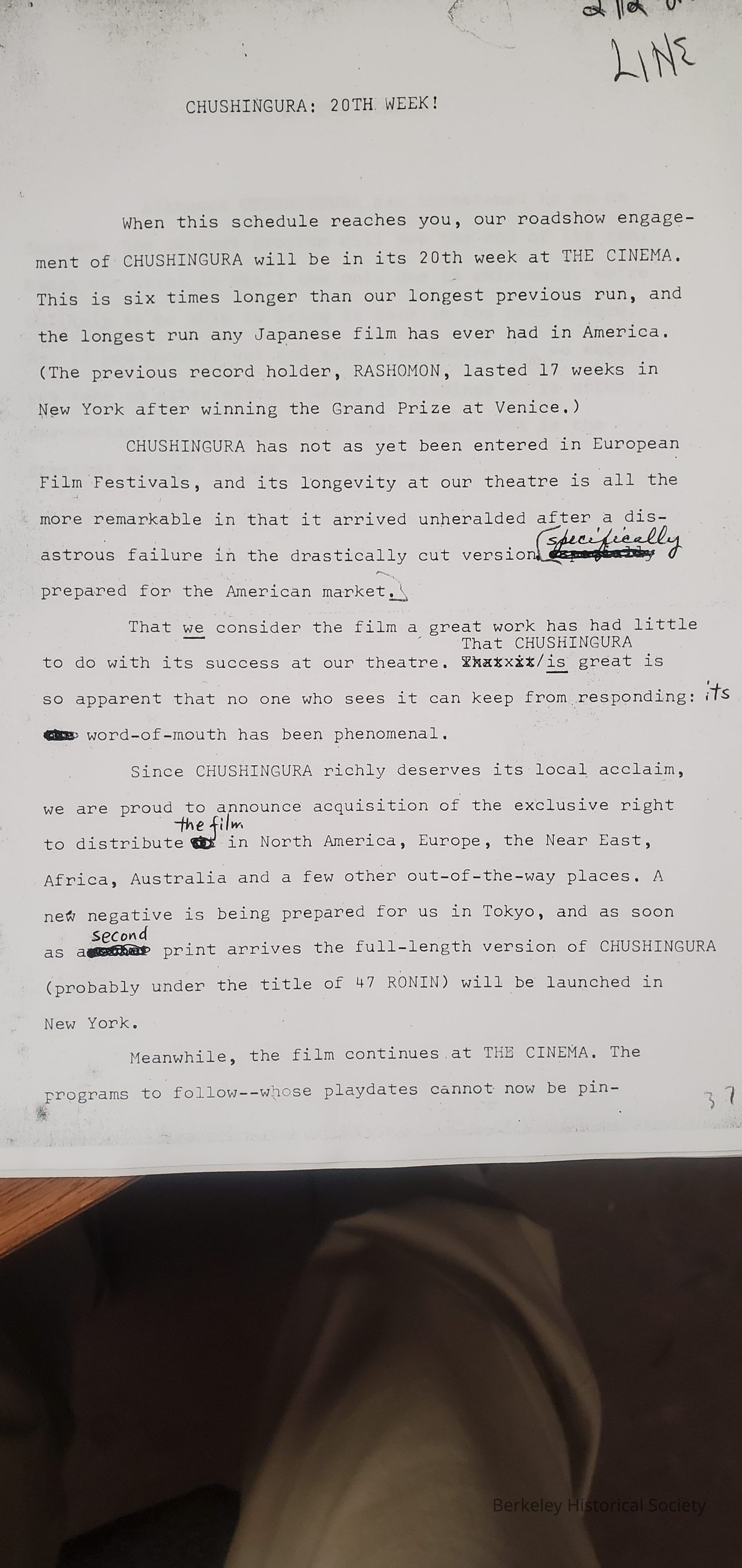 Writings for Cinema Guild programs, including several pages on Chushingura, and short articles on various films and directors, 1959-1962 and undated, all photocopies. Also blank sheet with embossed official seal of company, with founding date May 27, 1957.Archive Details