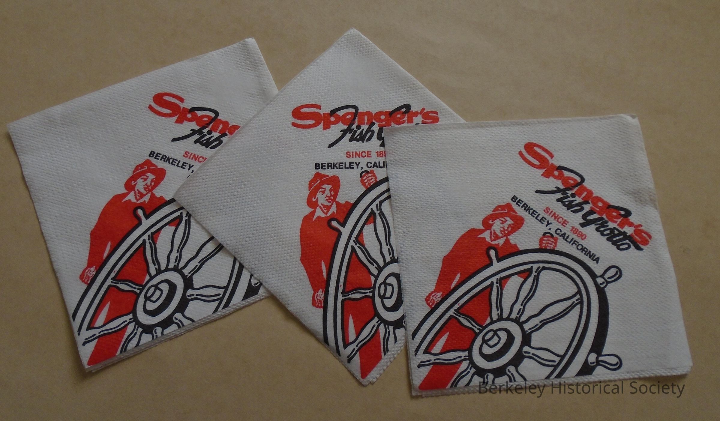 White paper napkin (3 identical) with red and black text: Spenger's Fish Grotto since 1890, Berkeley, California. Picture of a fisherman at the wheel of a ship.