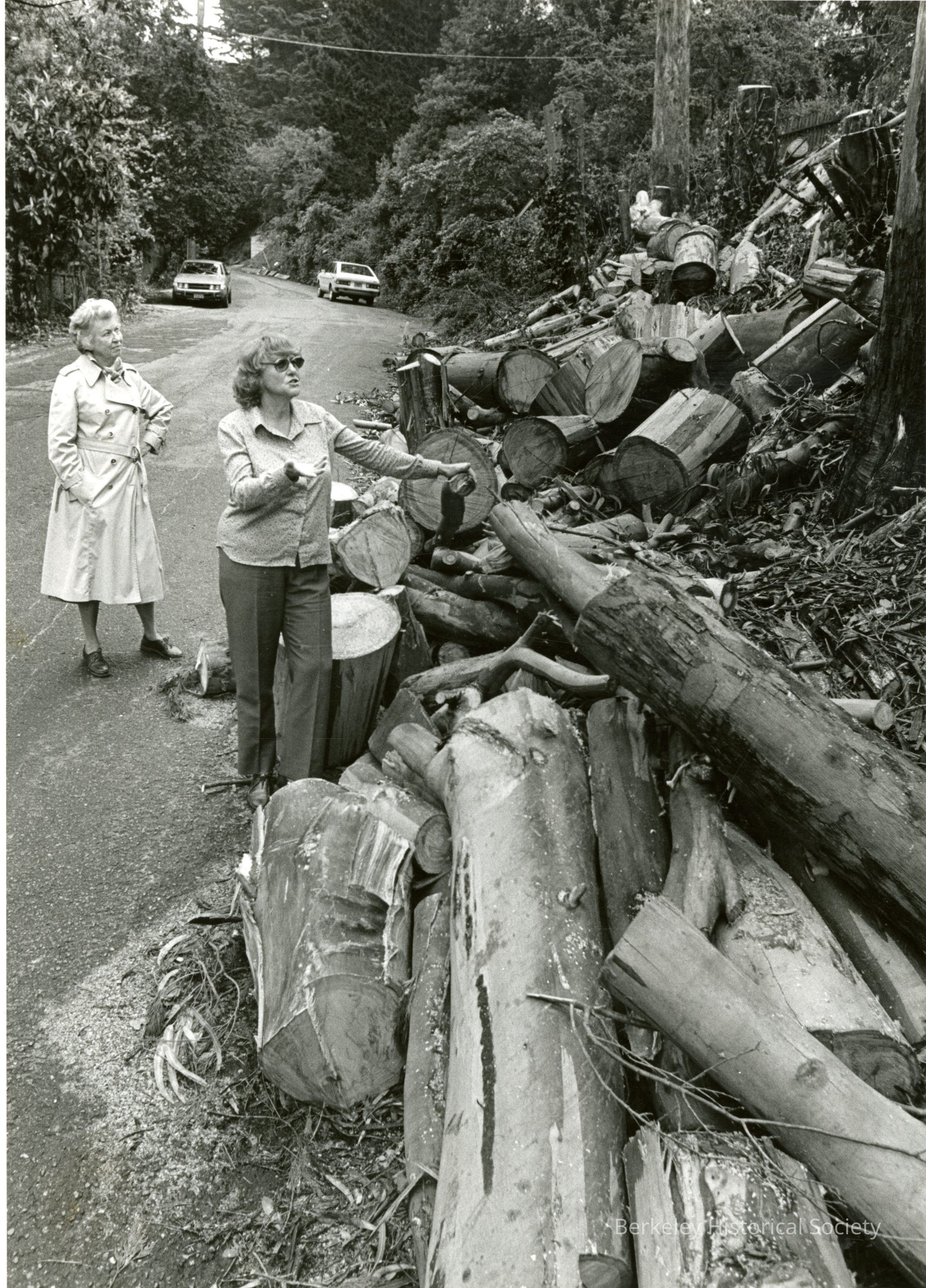 Berry Olds and Judy Olson looking at downed and sawed trees on Bret Harte WAy.