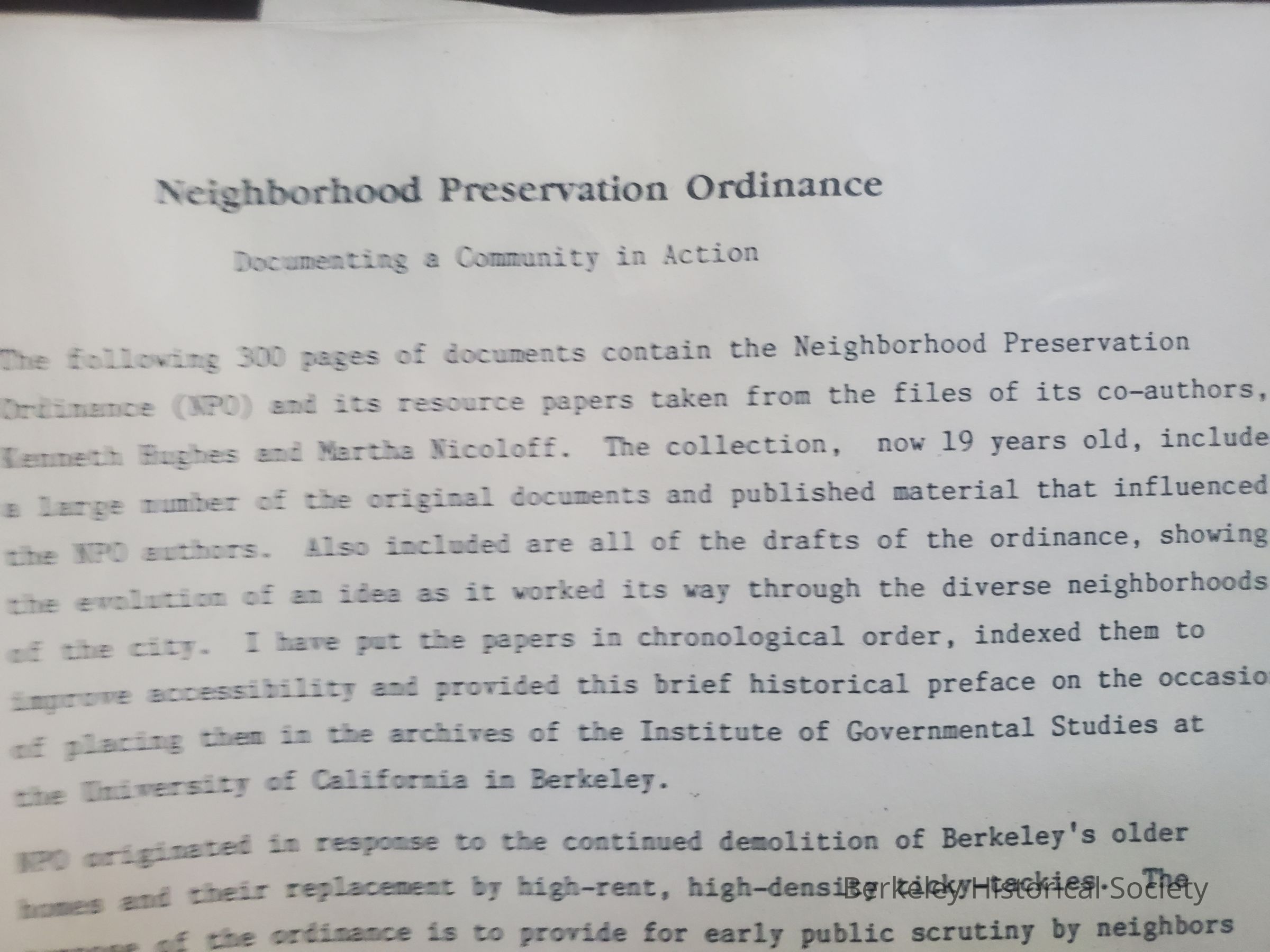Neighborhood Preservation Ordinance papersEntry/Object ID