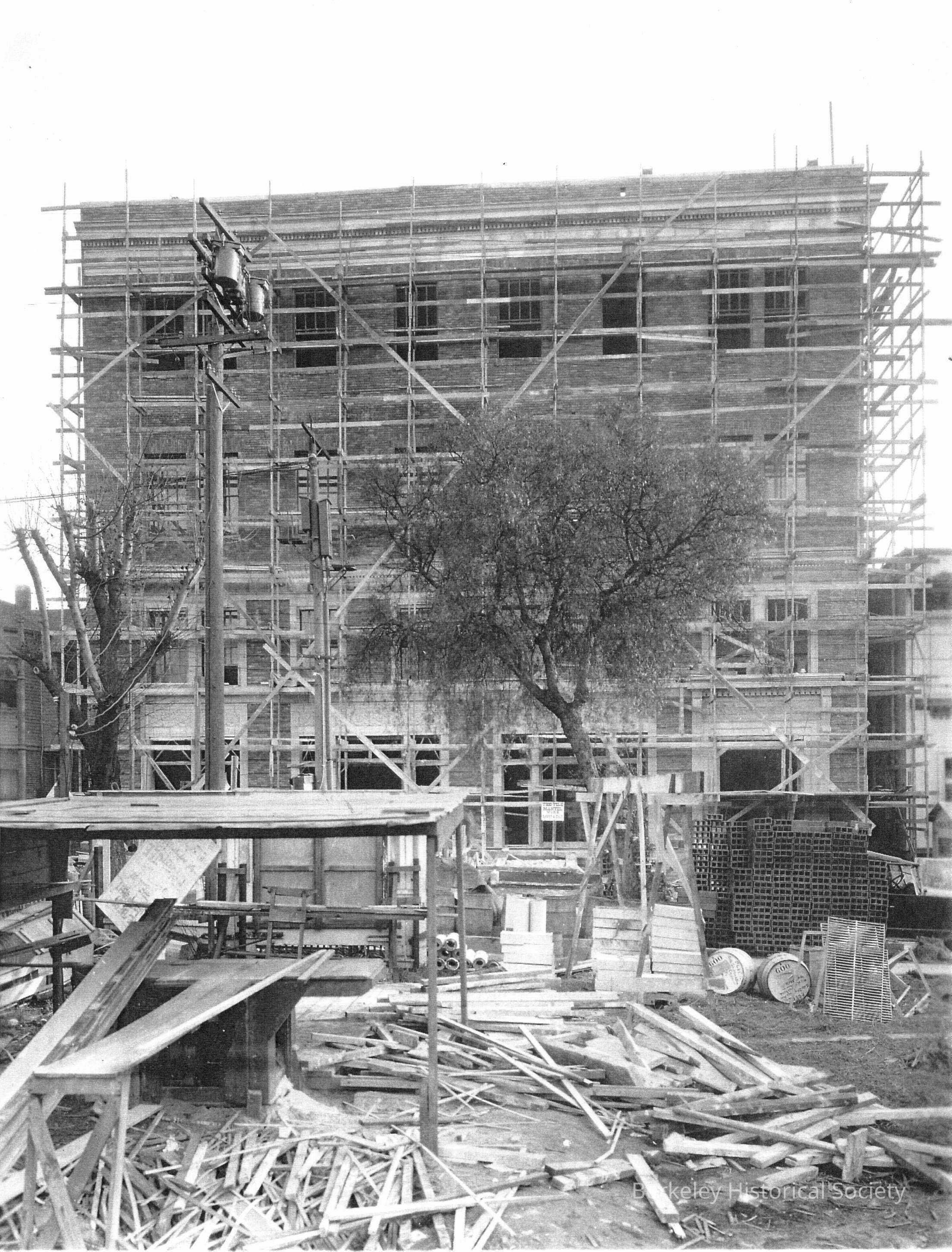 Scaffolding and debris in front of Pacific Telephone building, under construction
