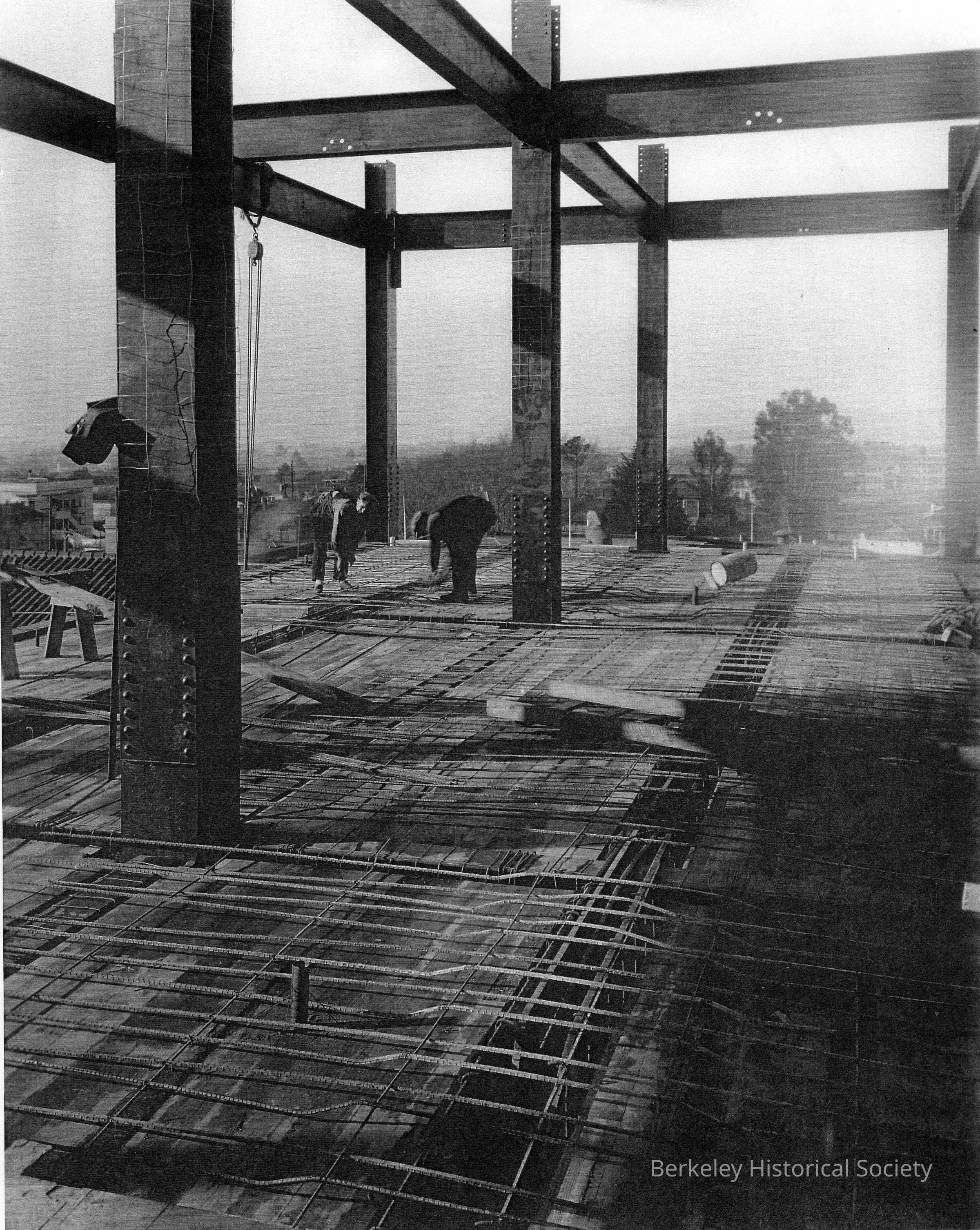 Pacific Telephone building contruction with workers and view of trees downtown