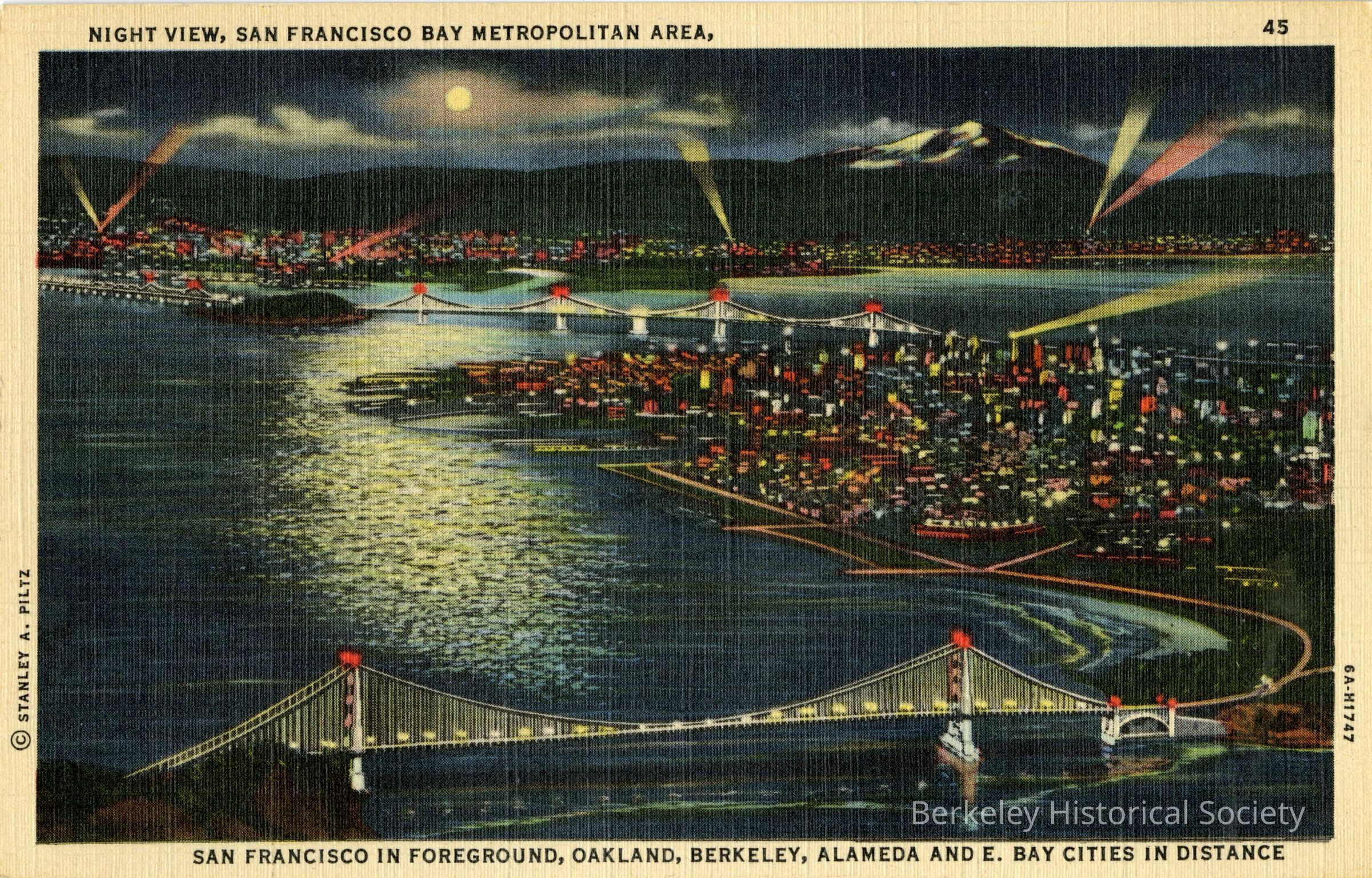 At bottom of card: San Francisco in foreground, Oakland, Berkeley, Alameda and E. Bay cities in distance