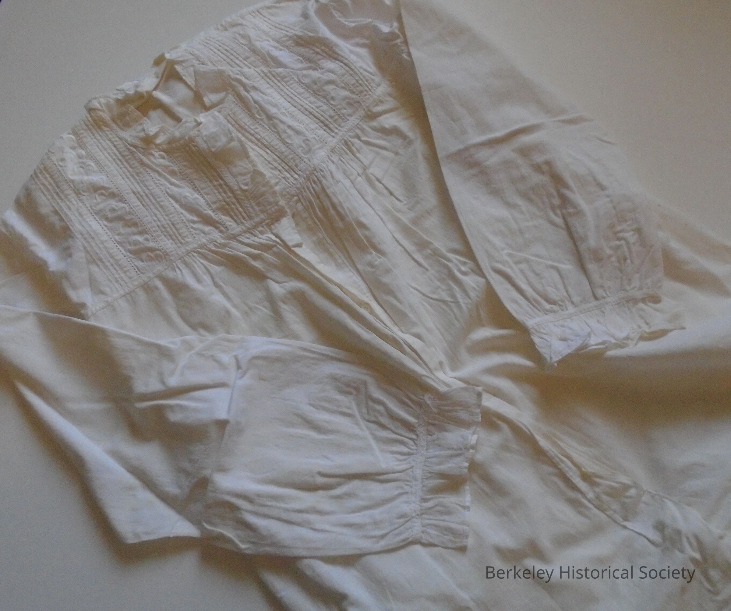 Long, white, cotton nightgown (woman's). Long sleeves with ruffle, embroidered yolk with tucks, ruffle at collar, opening in front with 3 buttons. Gores (insets) on each side seam. Label by 3rd button "Homemade Underwear". "Brown" written at bottom of opening. Gathers under yoke, front & back.Made/Created