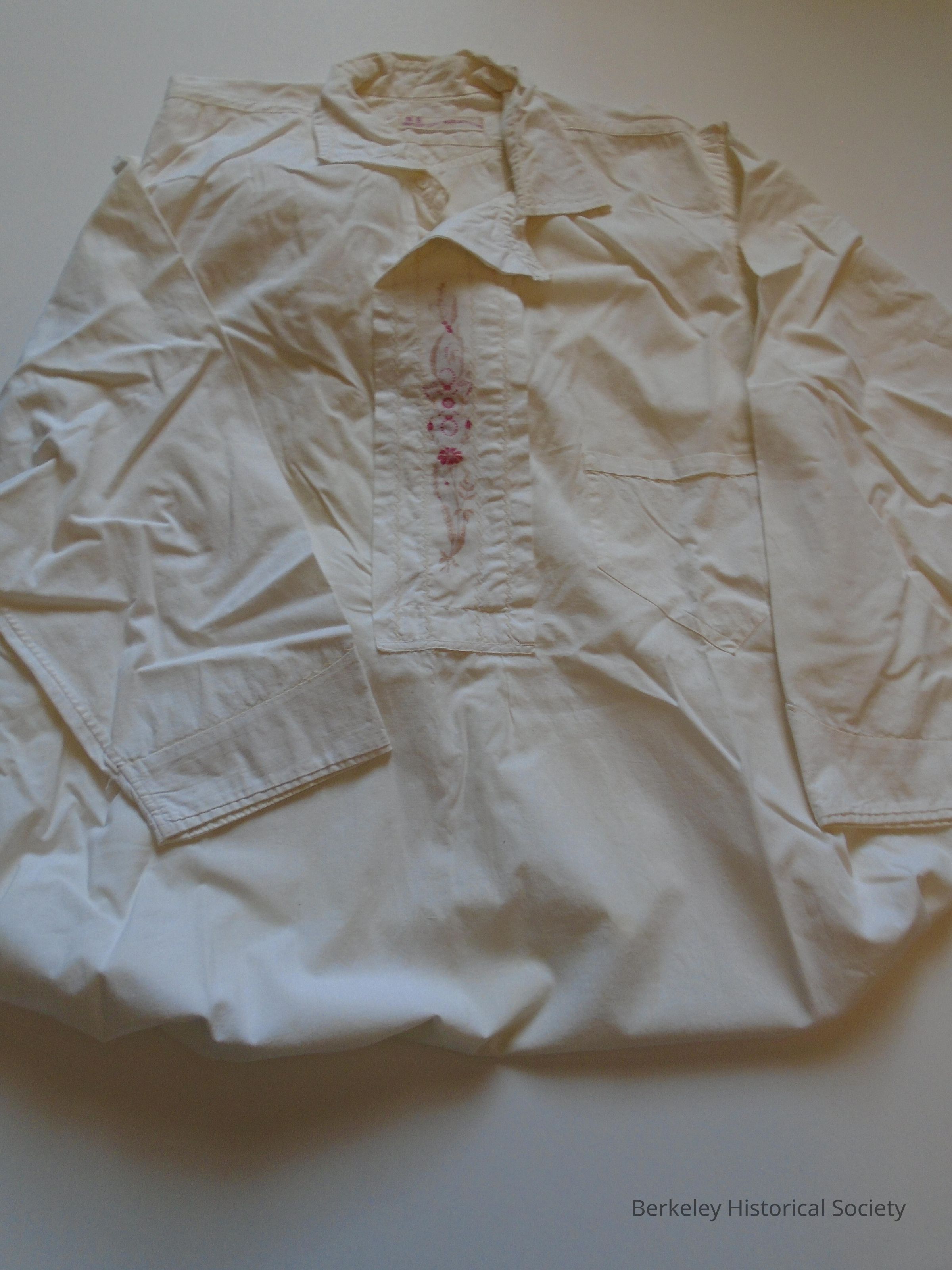 Man's white, heavy cotton, long sleeved nightshirt (nightgown). Zigzag detail trim on collar & front opening. Fine red & beige (woven) flower design at front opening & 2 buttons. Side pocket (left) and cuffs have zigzag detail trim. Pointed collar. Label at neck: "N.B. Patent Continuous Facing". Mostly double seams.