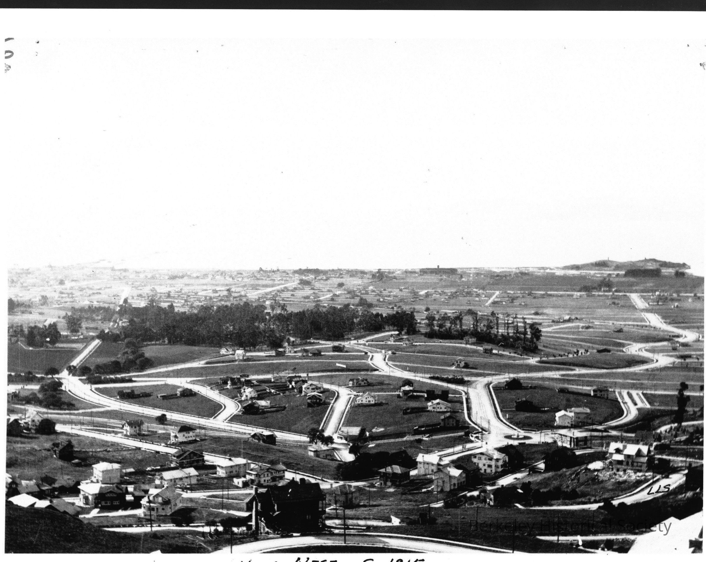 View from hills to bay; relatively new Northbrae streets with few houses in foreground. Hopkins Street to left, Marin to right.