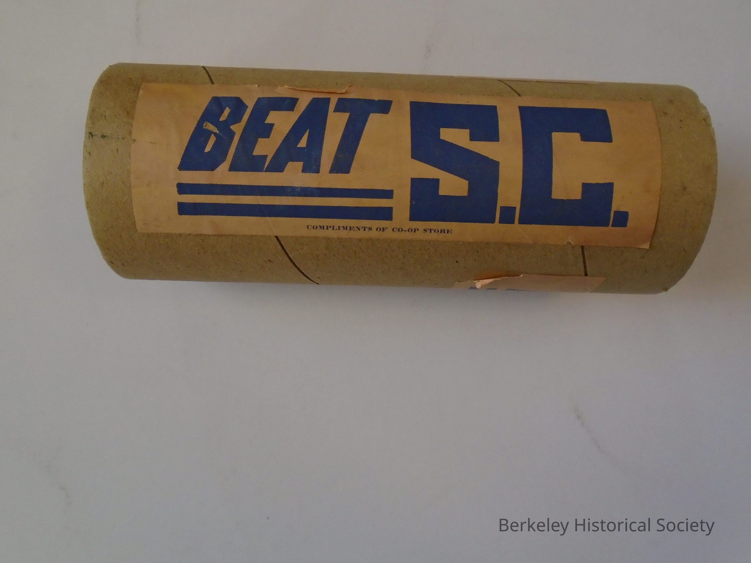 Empty tube of heavy cardboard with 2 stickers each reading "Beat SC" & "compliments of Co-op store". Stickers are gold background (faded) with dark blue letters. Penciled on the outside are the names: Lily Yamada, Micki.....(unclear).Made/Created