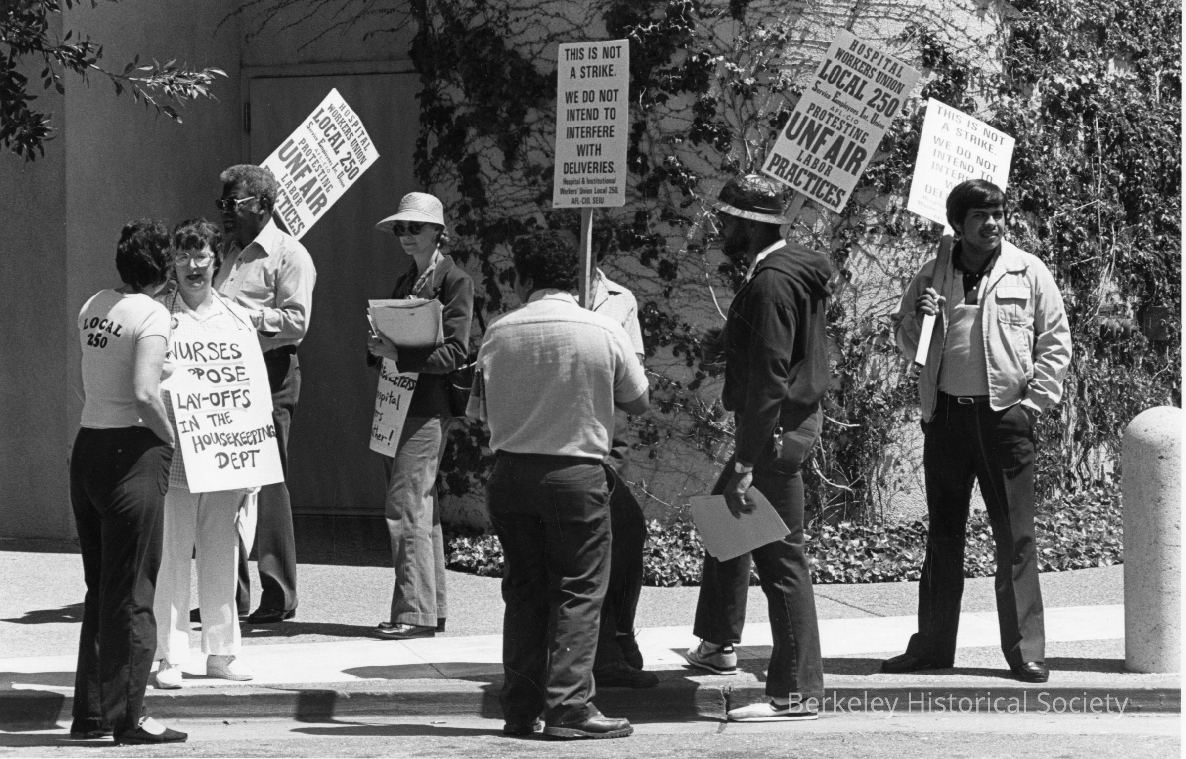Alta Bates Hospital nurses strike. Picketeers with placards.