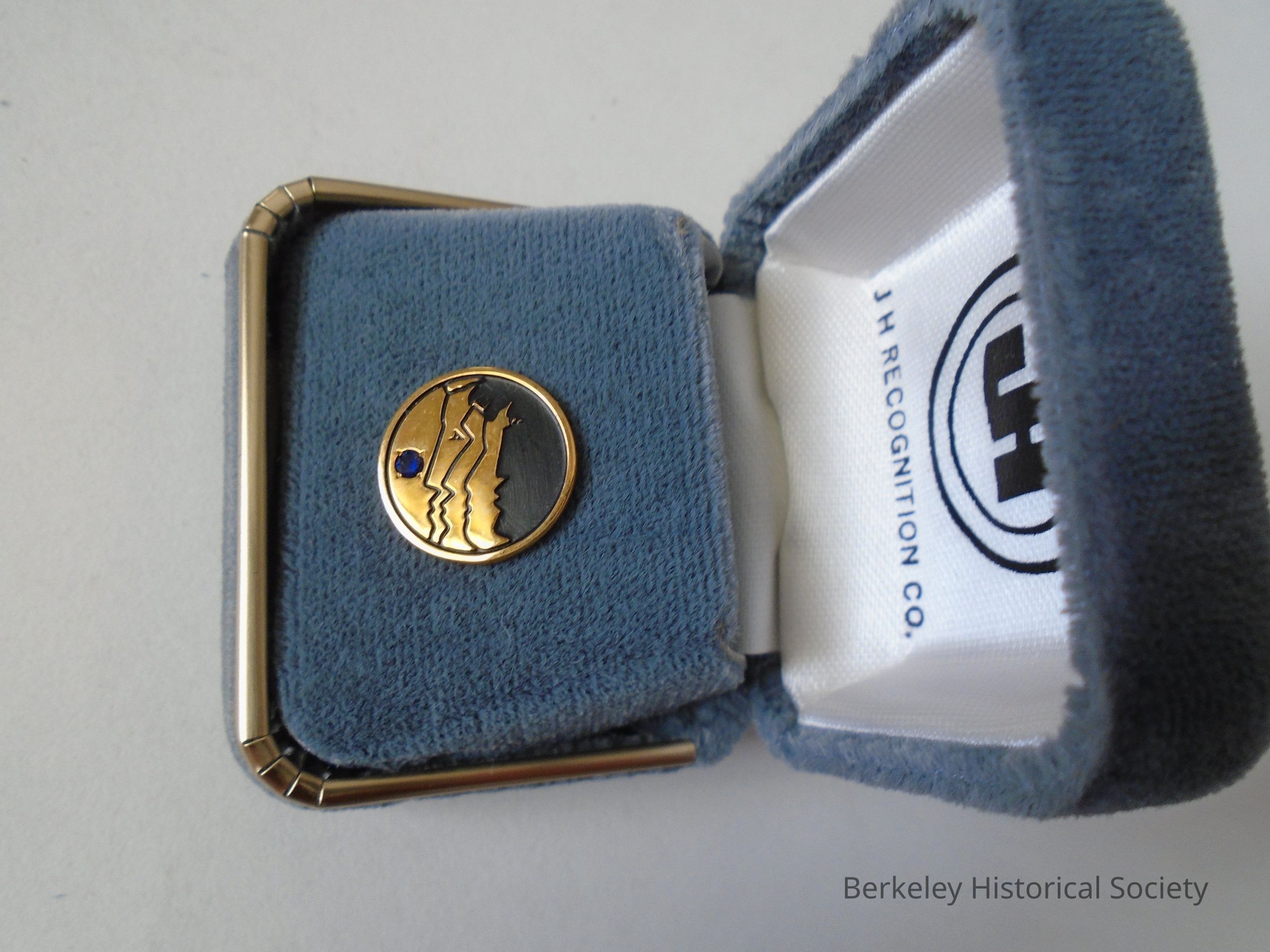 Round, gold metal commemorative lapel pin from the City of Berkeley in a grey velvet box. Pin has a green gemstone in it and Berkeley's logo of 4 overlapping faces. Made by J.H. Recognition Co. See also 2006.058.005, a duplicate.