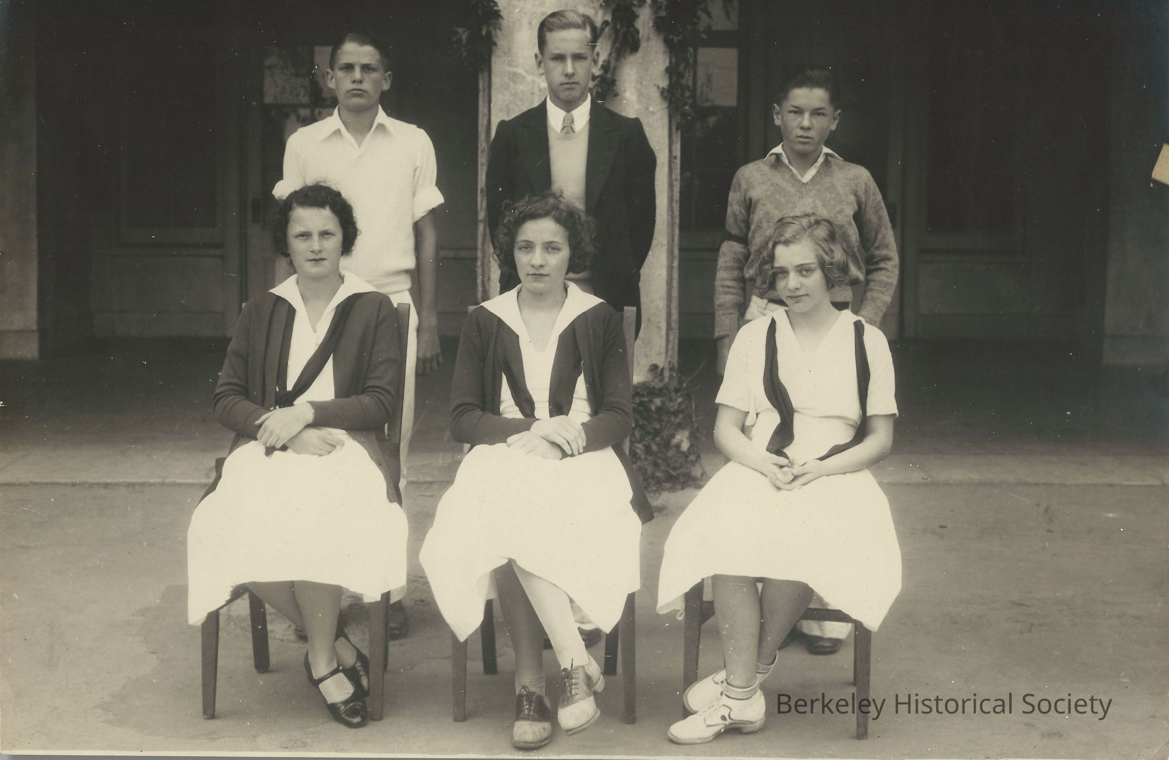 Three women seated, three men standing behind them