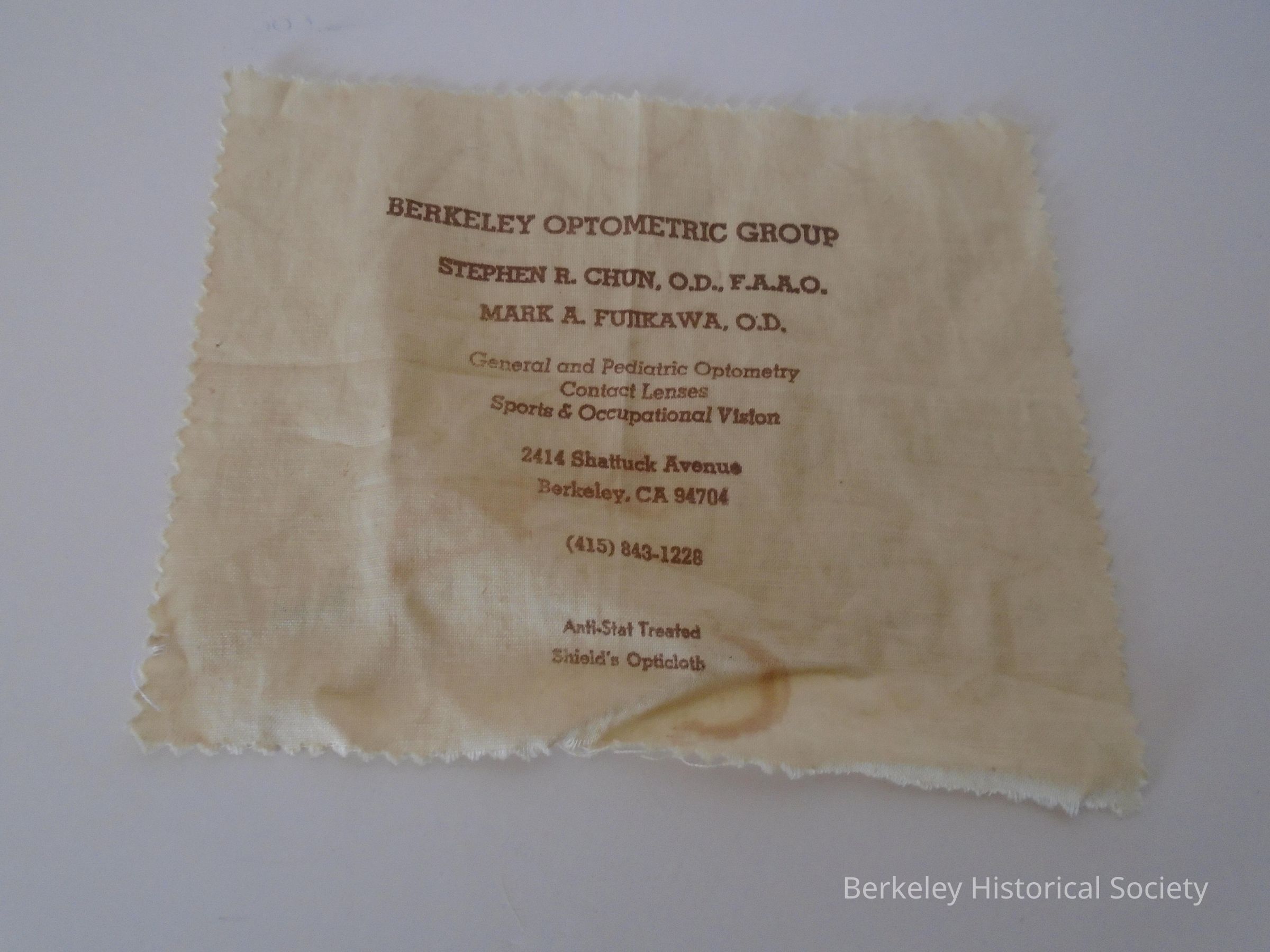 Eyeglass cloth (Optical cloth) for Berkeley Optometric Group Stephen R. Chun and Mark Fujikawa 2414 Shattuck Avenue Berkeley, CA 94704 (415) 843-1228. See also 1978.002.300 (duplicate).