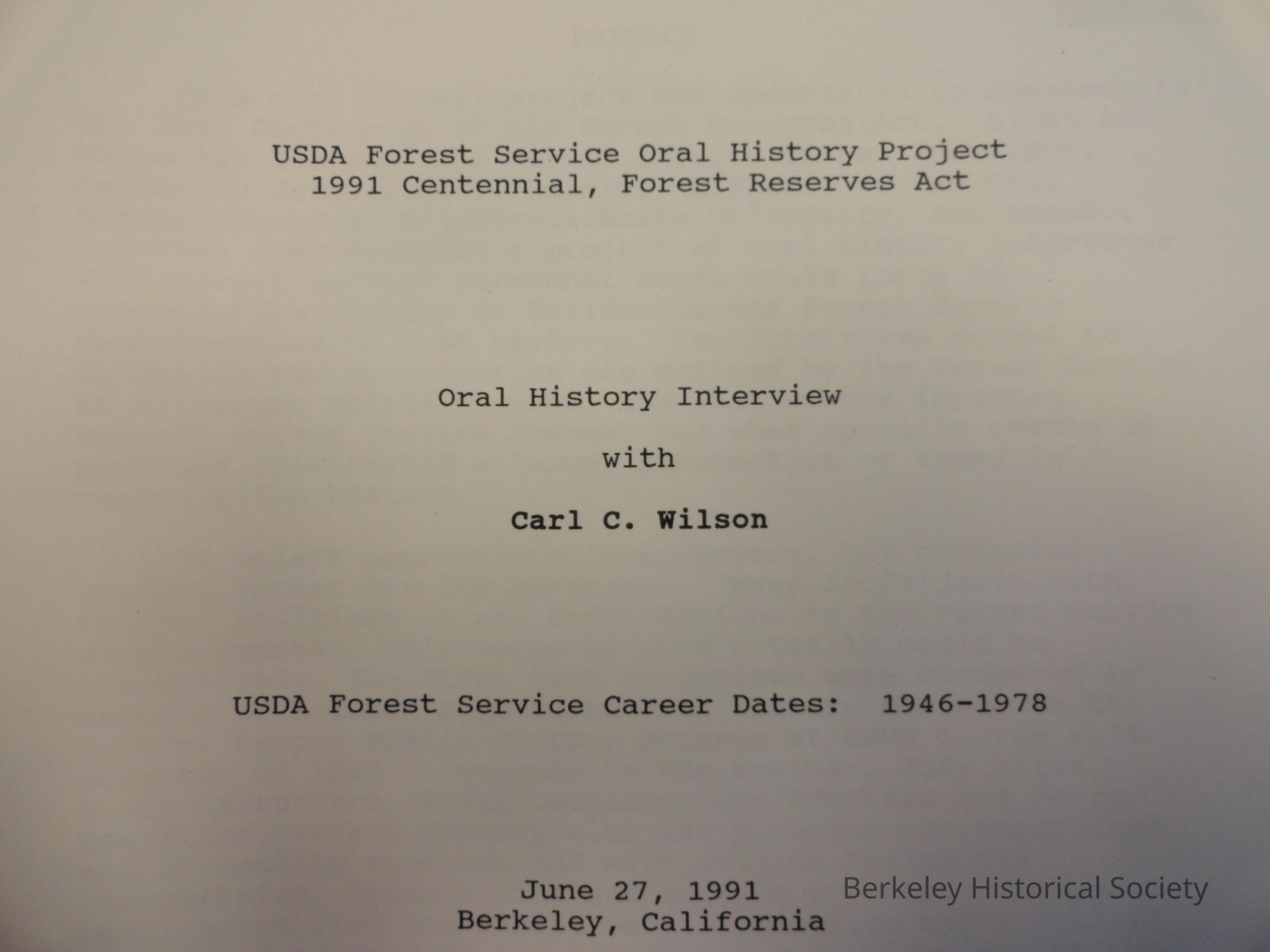 Interview conducted as part of the USCA Forest Service Oral History Project 1991 Centennial, Forest Reserves Tract. Interviewer, Susan Douglass, Capital Camput Public History Program and Oral History Program, Calif. State University, Sacramento.
