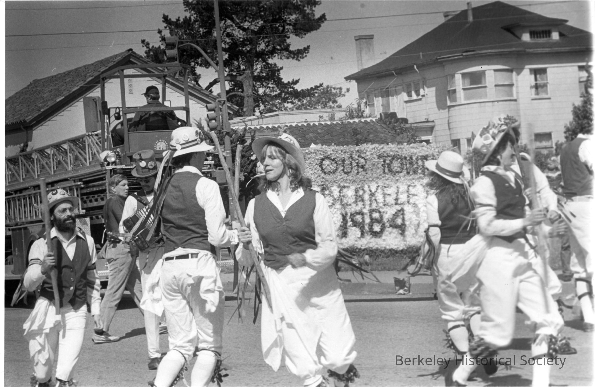 Morris Dancers; sign behind them "Our Town Berkeley 1984" Locvation undertain.Other Names and Numbers