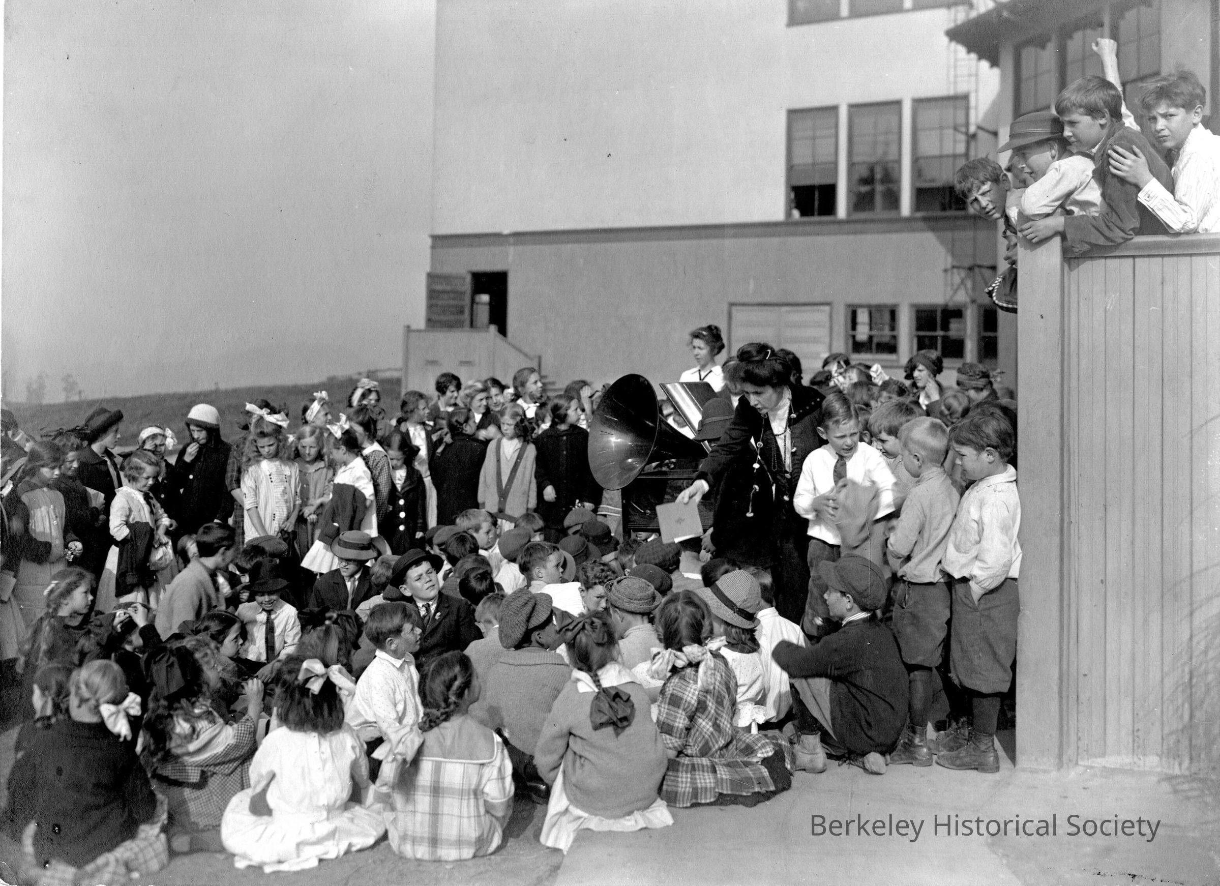 Large group of students around gramophone, outside building. Music appreciation.Other Names and Numbers