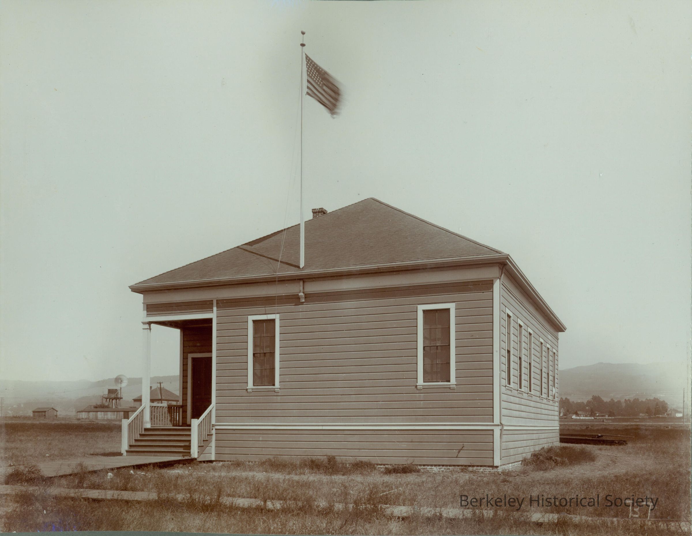 Page Street Primary school building, small and squared building in the flat land, an American flag on the roof, a few visible rural buildings in the backgroundMade/Created