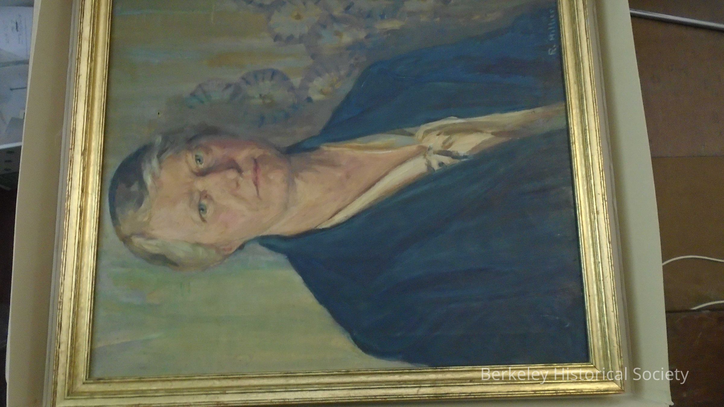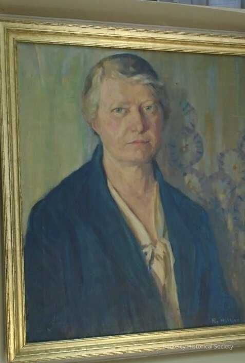 Oil painting of Miss Jeanette Barrows, Hillside School principal 1920-1937 when on Virginia Street and the first principal of the new school on Le Roy Street. In a relatively plain gold frame. Painted by Rosalie Hillier of Shasta Road.Lexicon