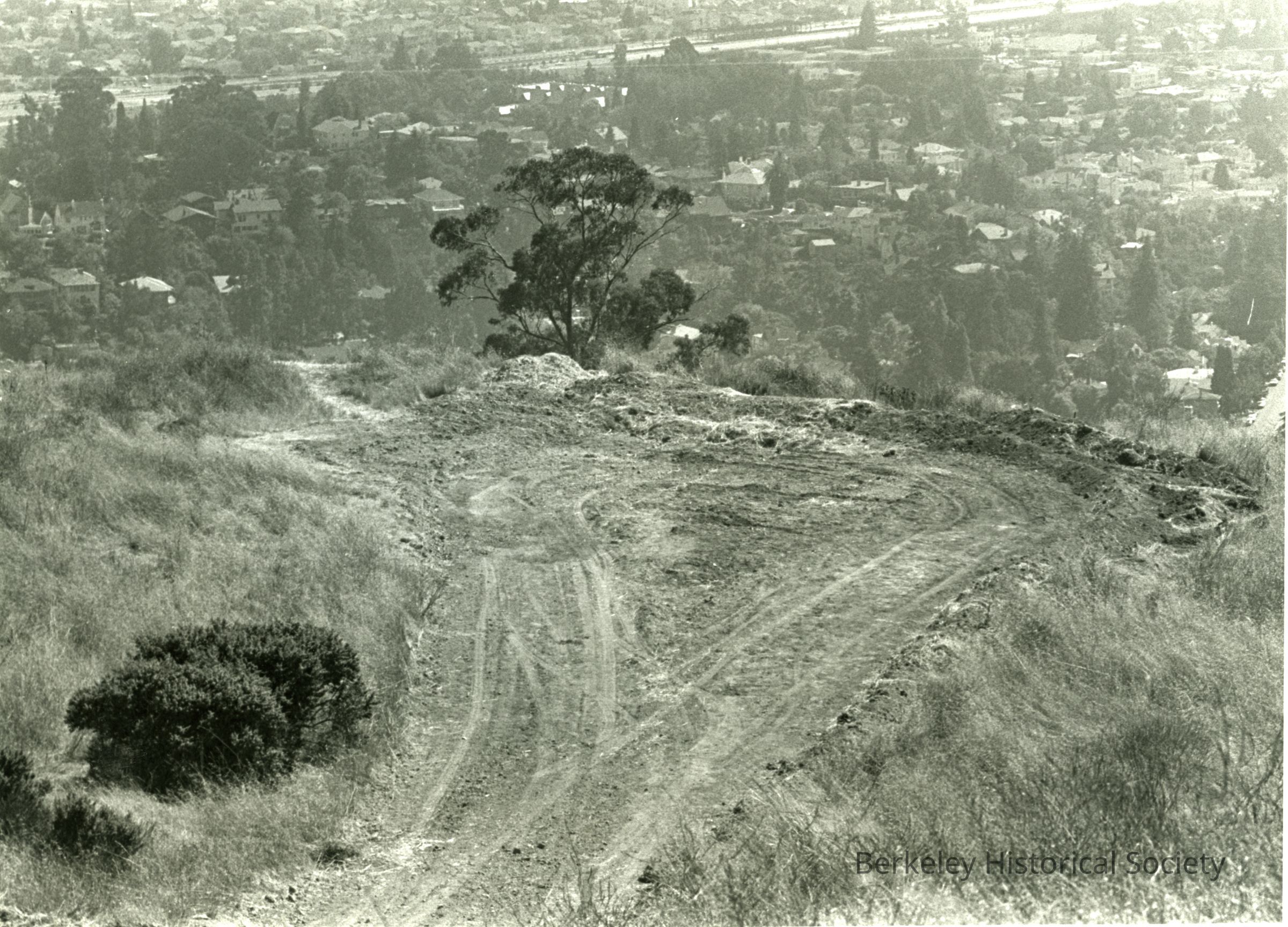 View west from hills above Claremont Canyon, with steep hill in foreground, tire tracks leading to edge of hill. Freeway CA24(?) in distance but location somewhat uncertain.