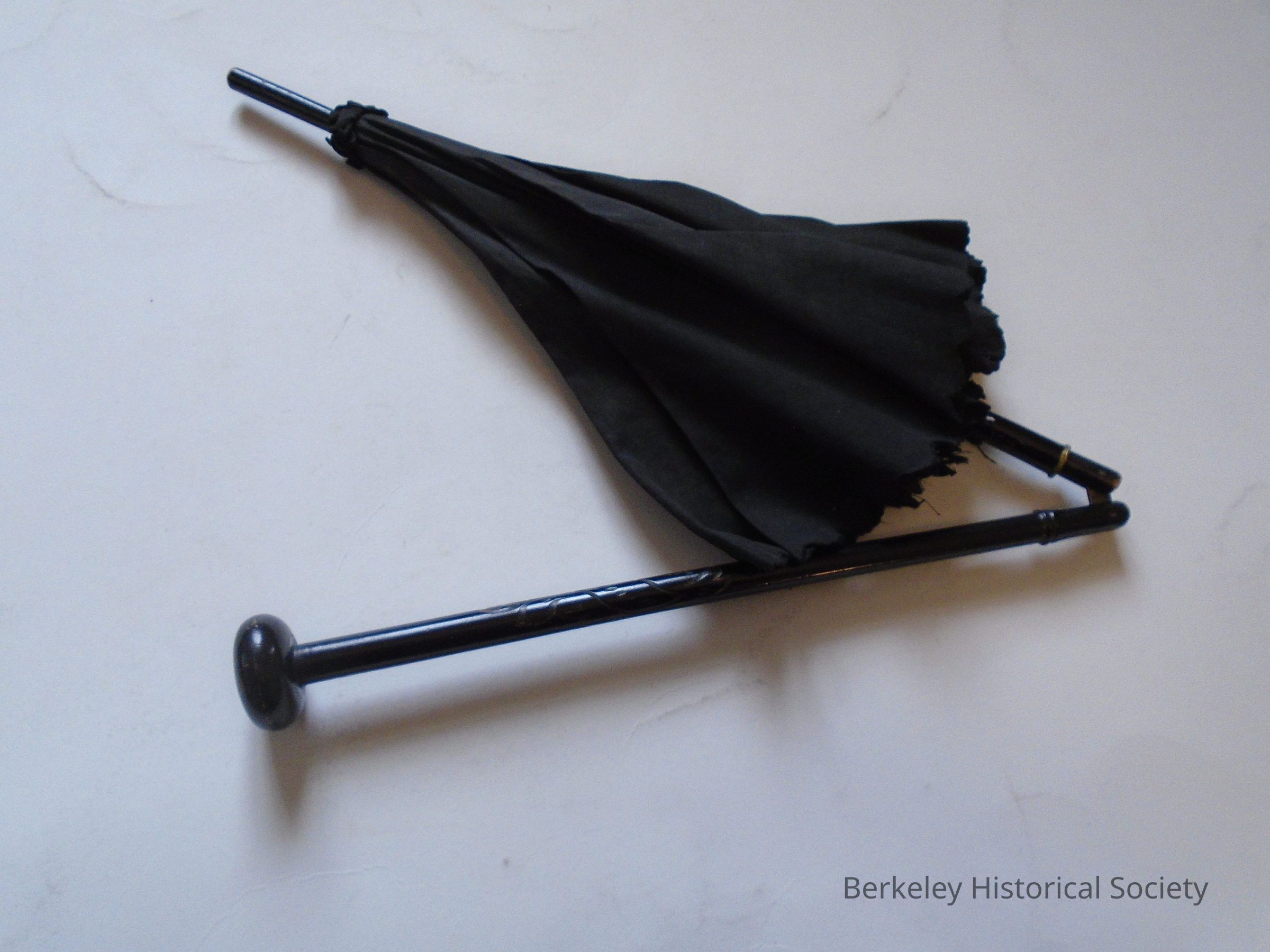 Black silk parasol (double layer of silk) with scalloped edge. Wood handle folds in half. Used by Mrs. George Swain, who lived at 2717 Telegraph Ave. on afternoon drives.