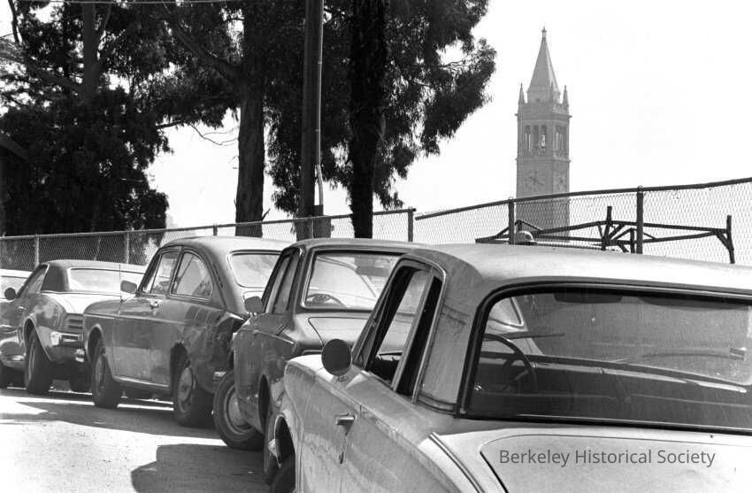 Cars parked on street above Stadium, Stadium Rim Way. Campanile in background.