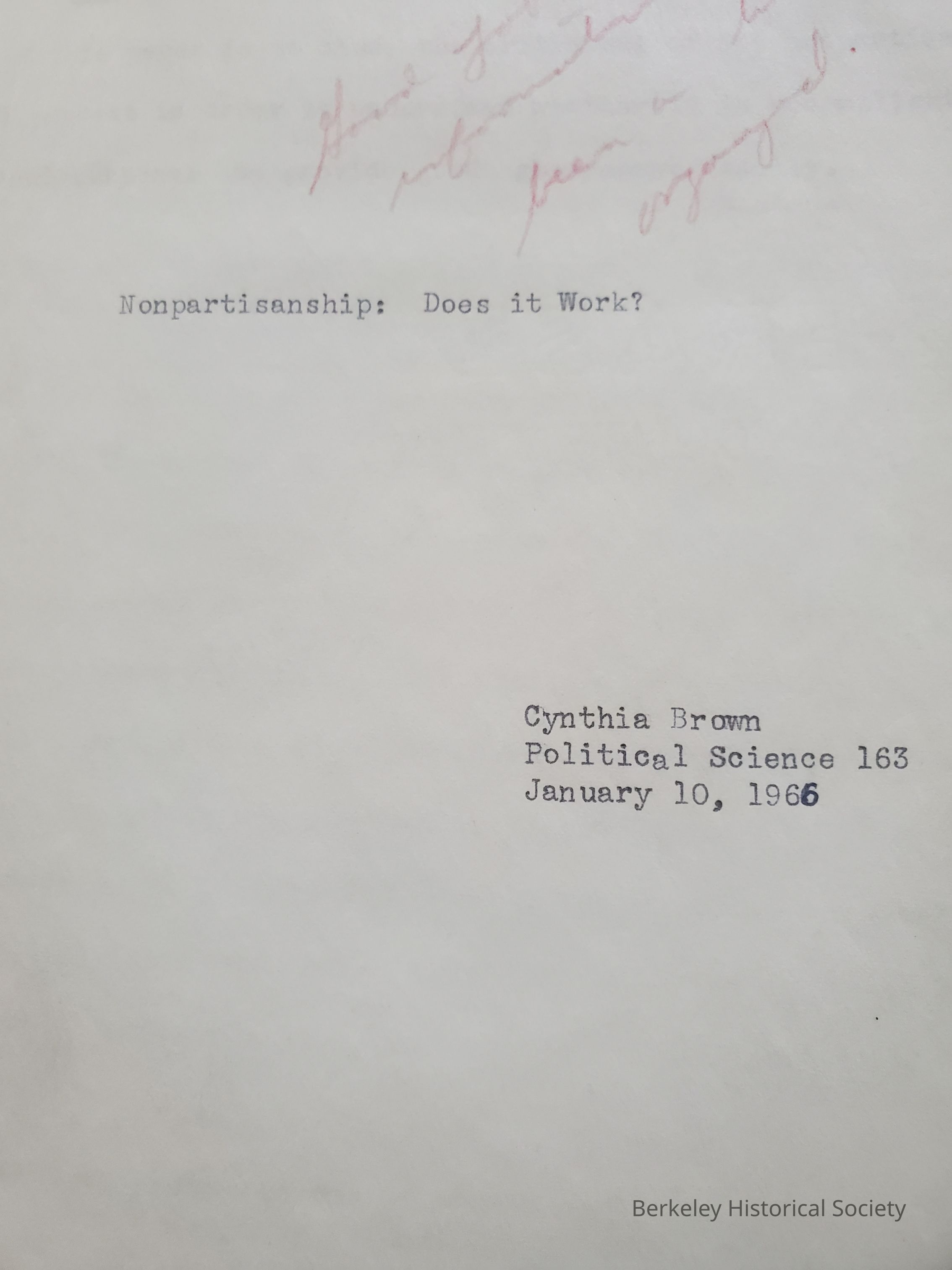 Paper by Cynthia Brown: "non-partisanship: does it work?" Done for a political science class in 1966; institution not identified. Instructor's markings throughout.