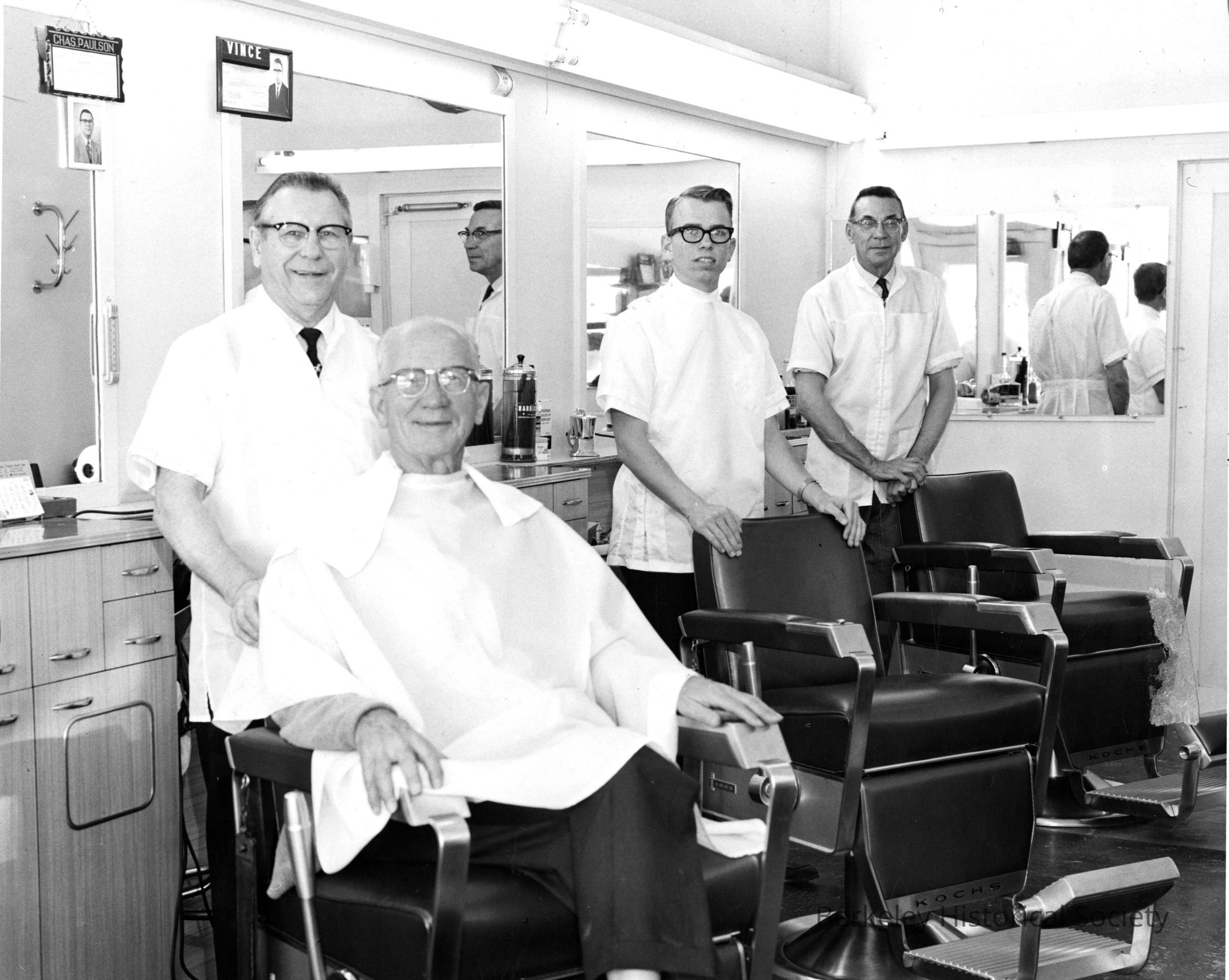 Three barbers behind chairs; one customer in first chair, with Charles Paulson. Another barber identified only as Vince; third barber unidentified. Shop at 1787 Solano Avenue.Other Names and Numbers