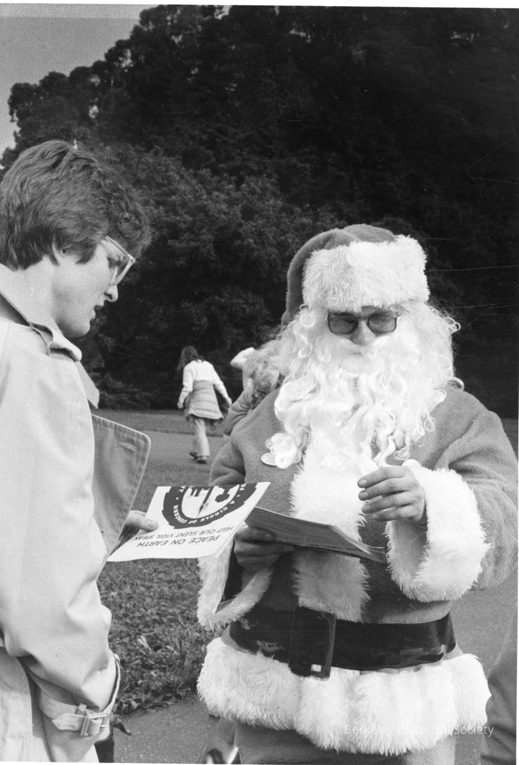 Two people, one in Santa Claus constume, looking at flier; possibly at Hearst Avenue and Euclid Street.