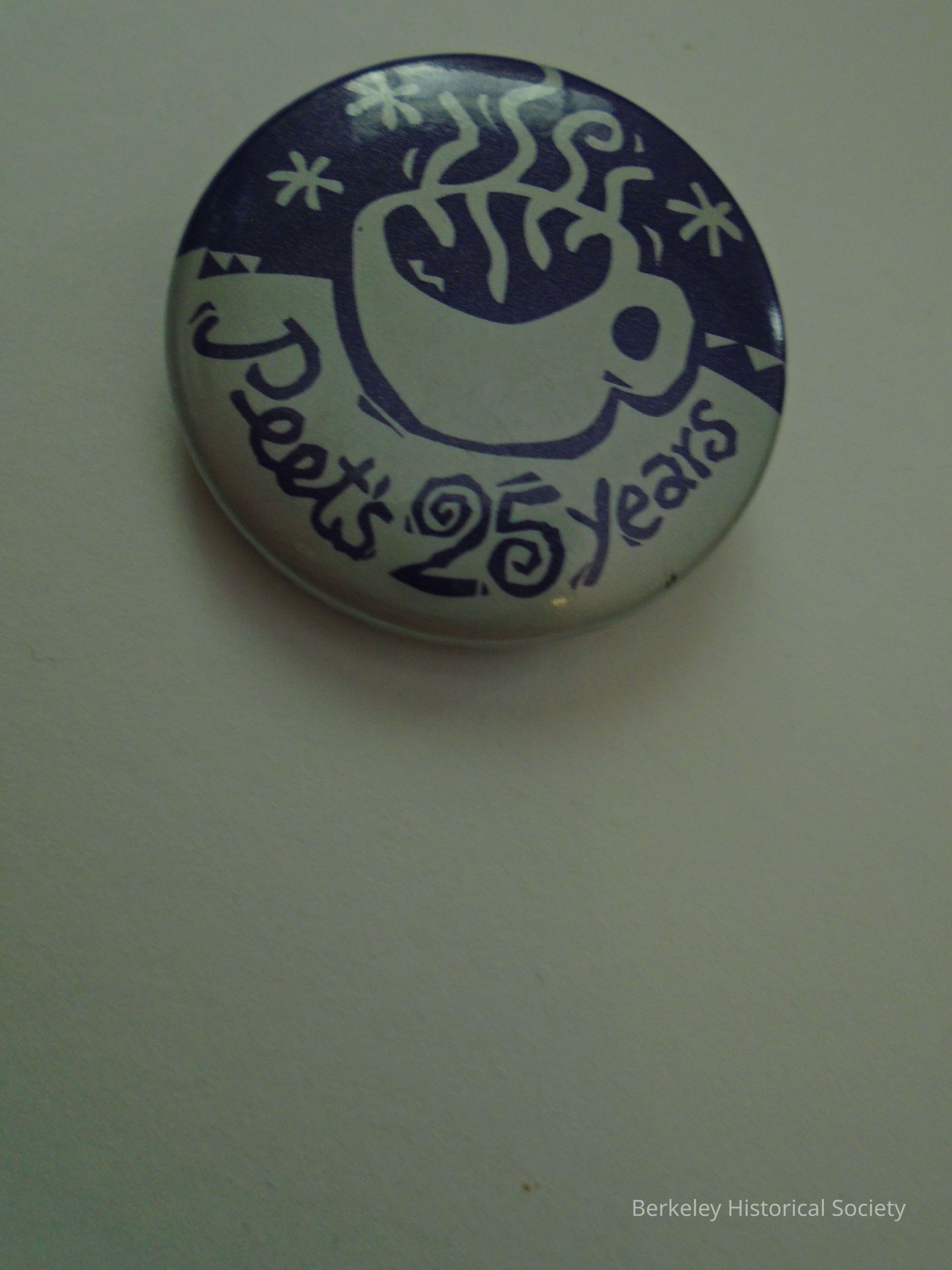 Blue and silver, round metal & paper button advertising Peet's 25 years. Duplicate 1978.002.158