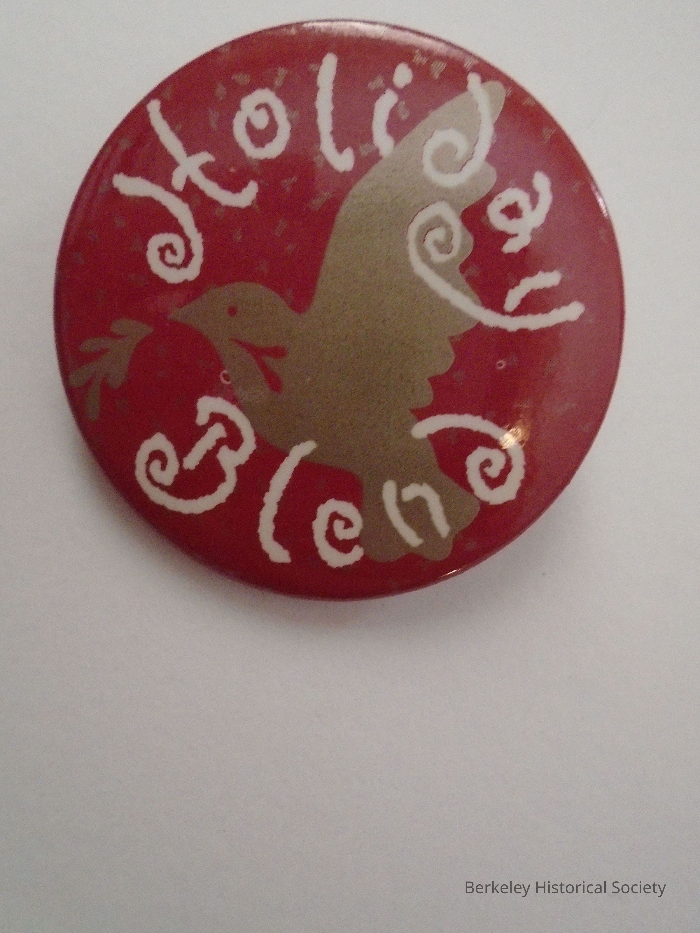 Round metal button. Red background with gold snow and peace dove and white lettering: "Holiday Blend". Peet's Coffee.