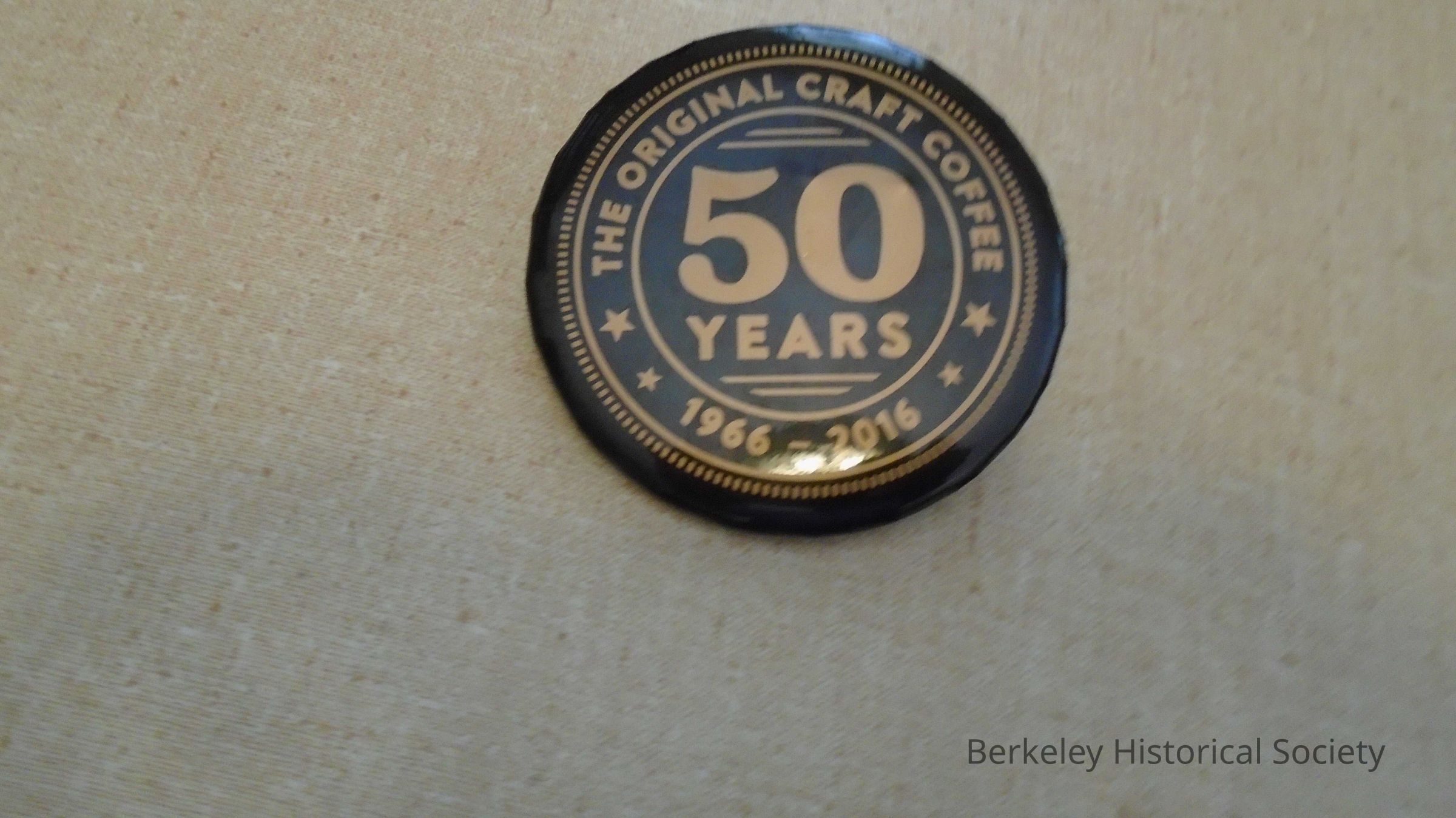 Metal and paper promotional button for Peet's Coffee. Pin on back. Black with gold lettering "50 YEARS 1966-2016 THE ORIGINAL CRAFT COFFEE". The first Peet's Coffee store started on Vine and Walnut Streets in Berkeley in 1966 by Alfred Peet (born in Holland).