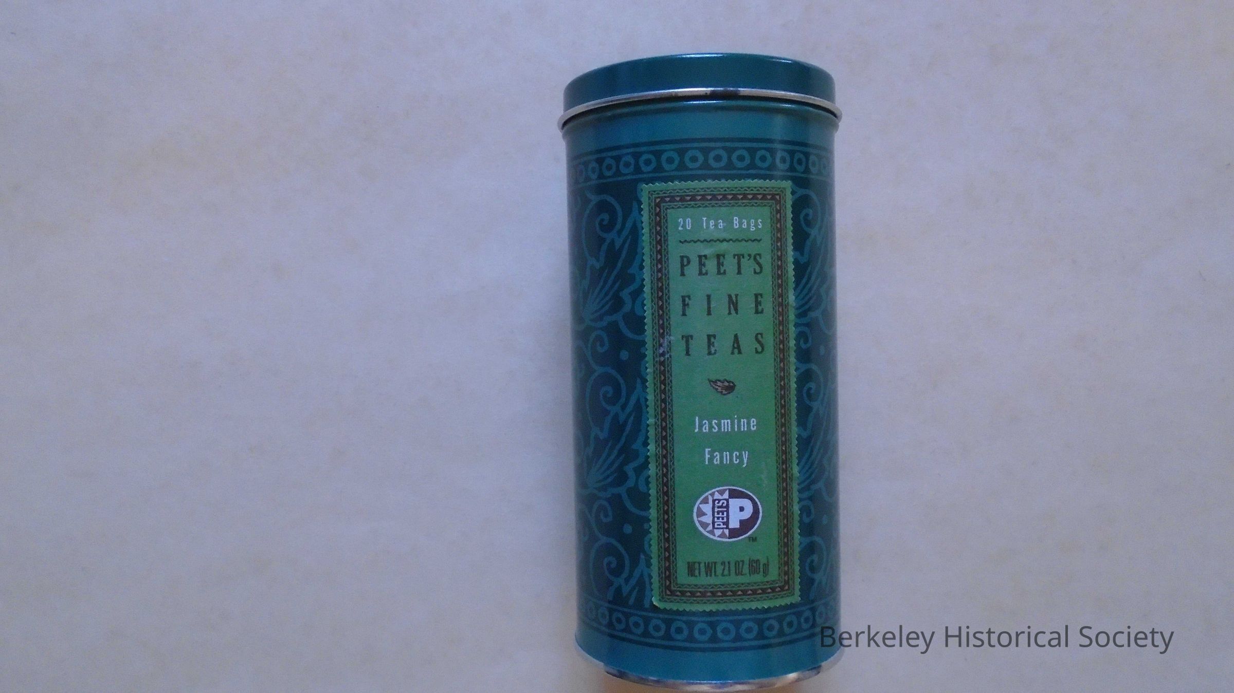Round, tall, metal canister with lid. Green and brown, with Peet's logo and "PEET'S FINE TEAS Berkeley, California, Jasmine Fancy 2.1 oz". on it.Made/Created