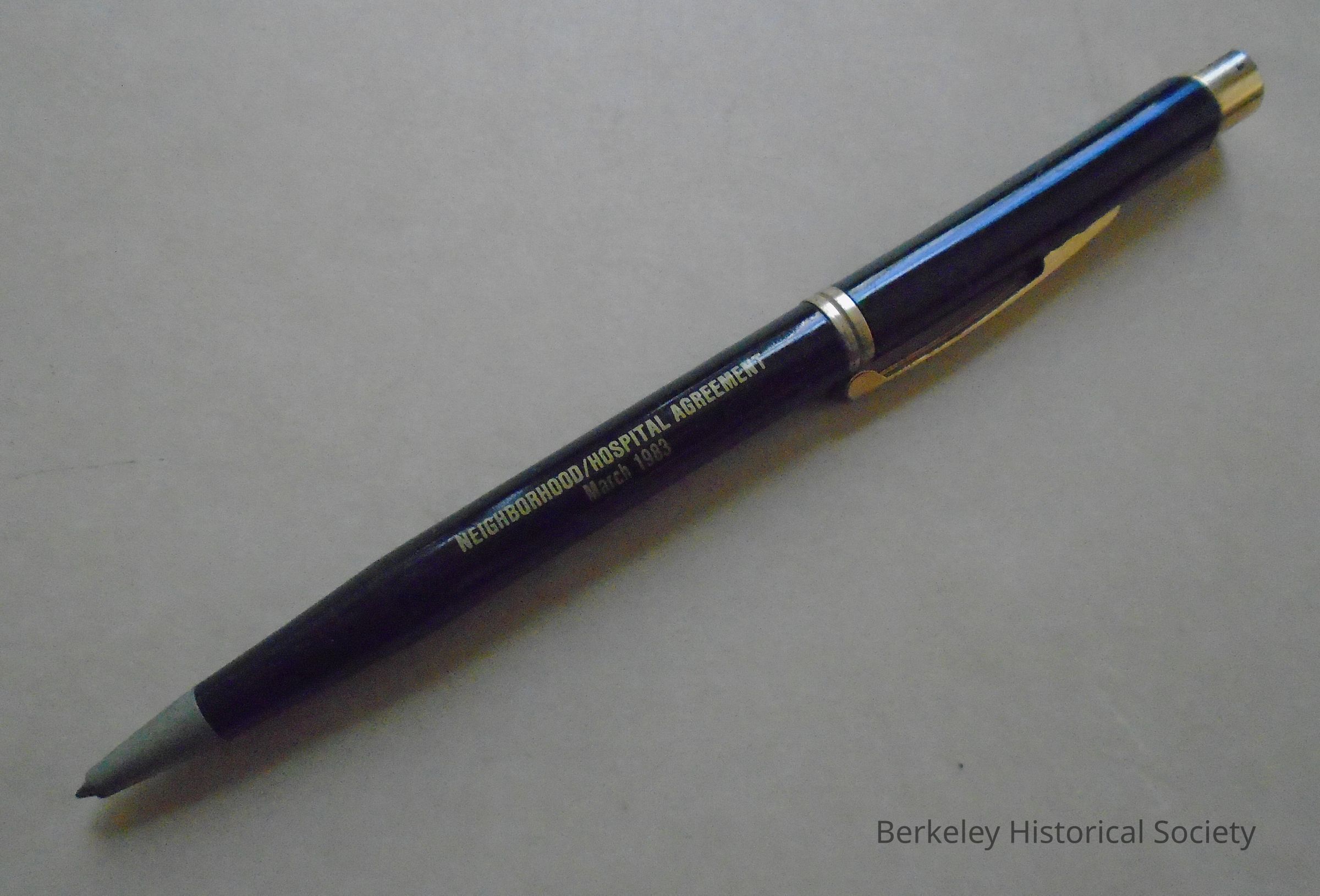 Black plastic ball point pen with gold trim on top, center and tip. Gold-colored metal clip with "Alexander" printed down front. Top plastic portion twists to reveal pen tip. Text in gold: "Neighborhood/Hospital Agreement March 1983" on bottom portion of pen. Blue-black ink. Provenance: Alta Bates HospitalMade/Created