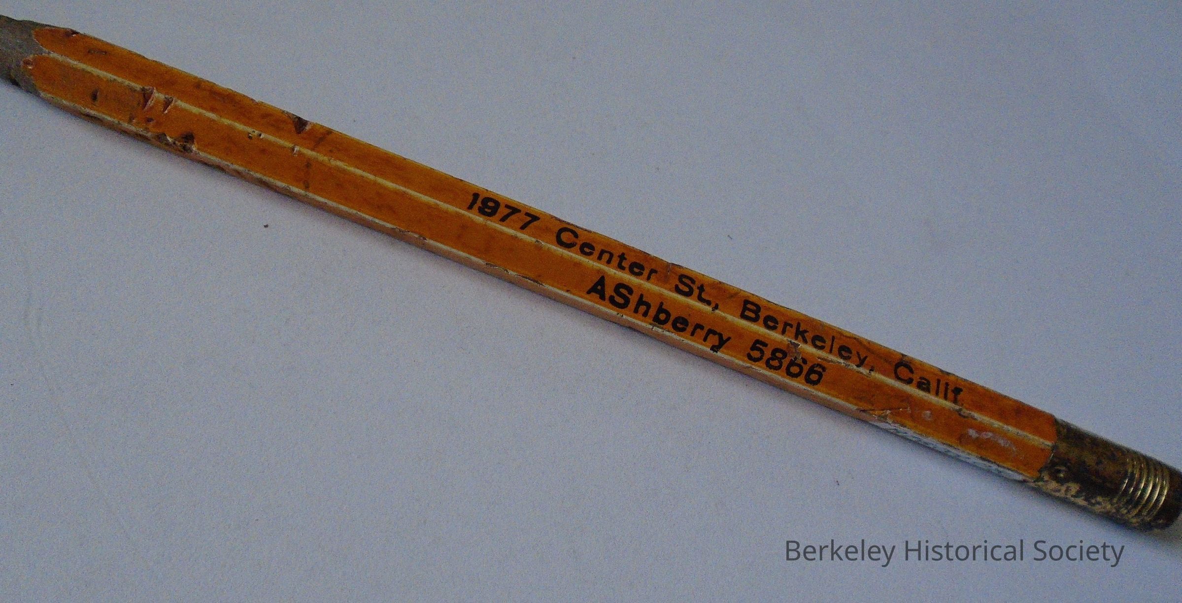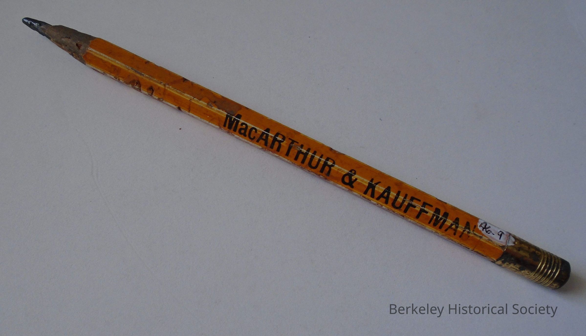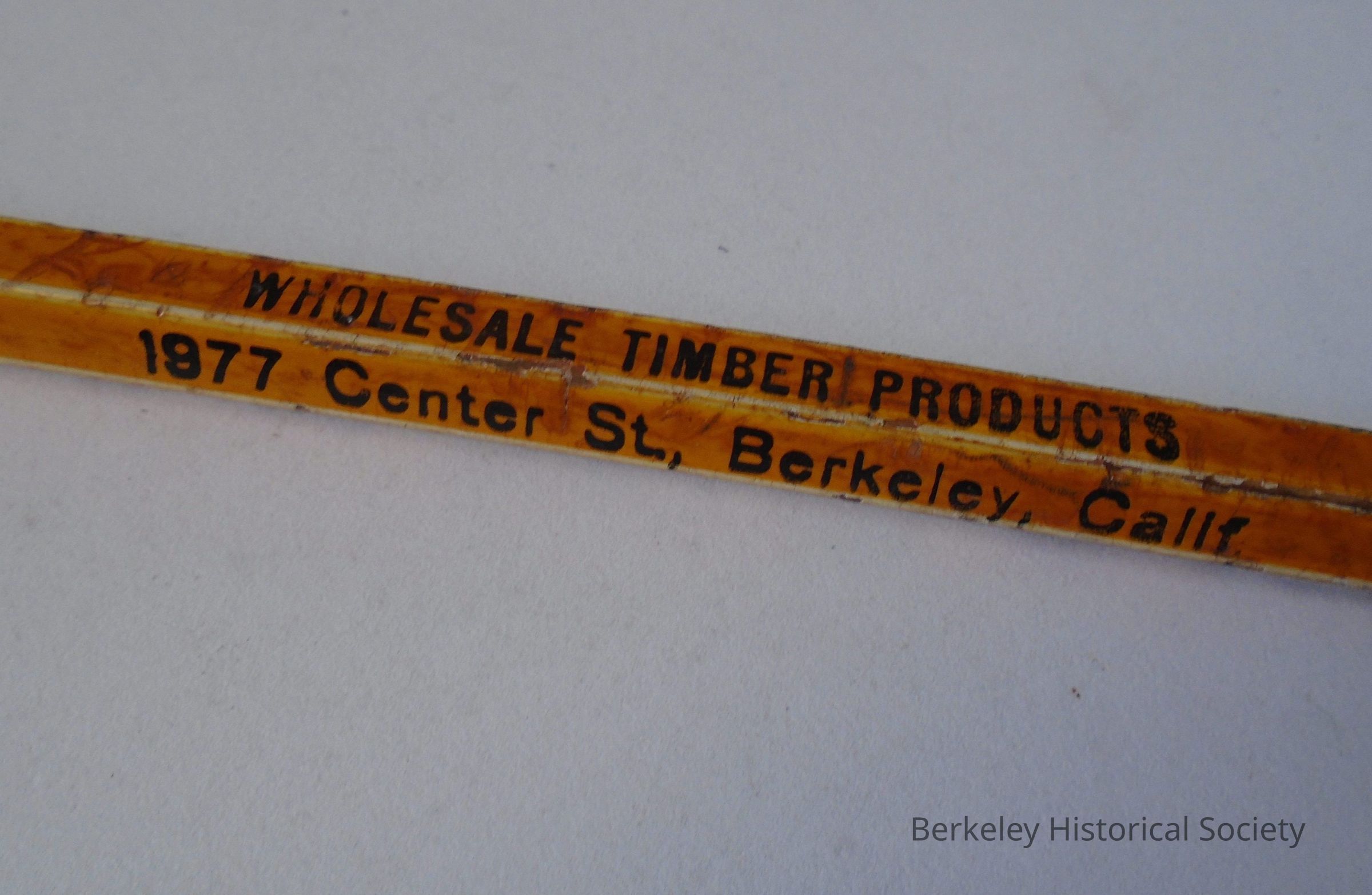 Oversized yellow carpenter's pencil with eraser at end. Inscribed "MacArthur and Kauffman, wholesale timber products, 1977 Center St, Berkeley, Calif., AShberry 5866". Pencil is very gouged at tip, as if chewed.Made/Created