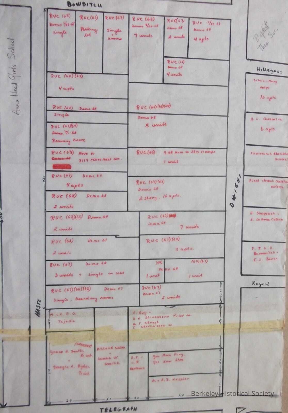 Preparer unknown. Assumes date (two letters 19__) of purchase. Demolition date 19__. On back is note: People's Park - Land Ownership & Previous Living Units Demolished dates.