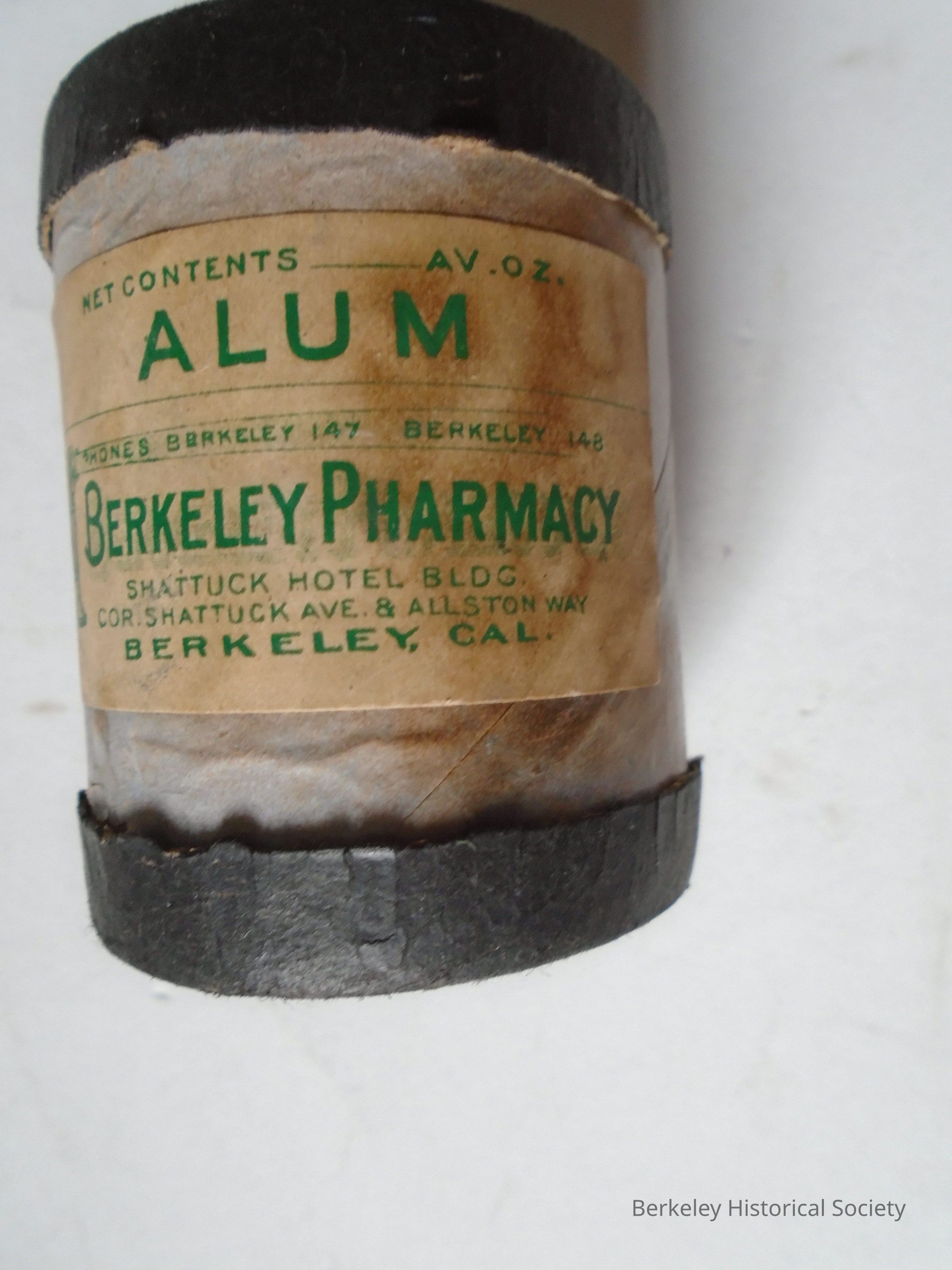 Round grey and black cardboard and paper pharmacy container for ALUM from Berkeley Pharmacy, corner Shattuck Ave. & Allston Way, phone Berkeley 147 & 148.Made/Created