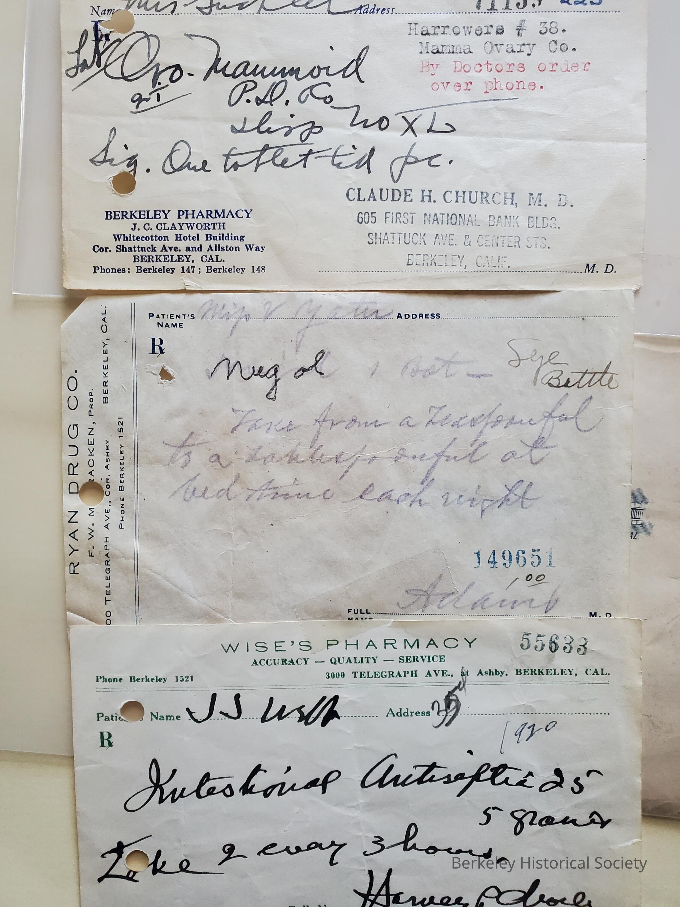 Collection of prescriptions by Berkeley doctors and pharmacists. See list in collections binder.