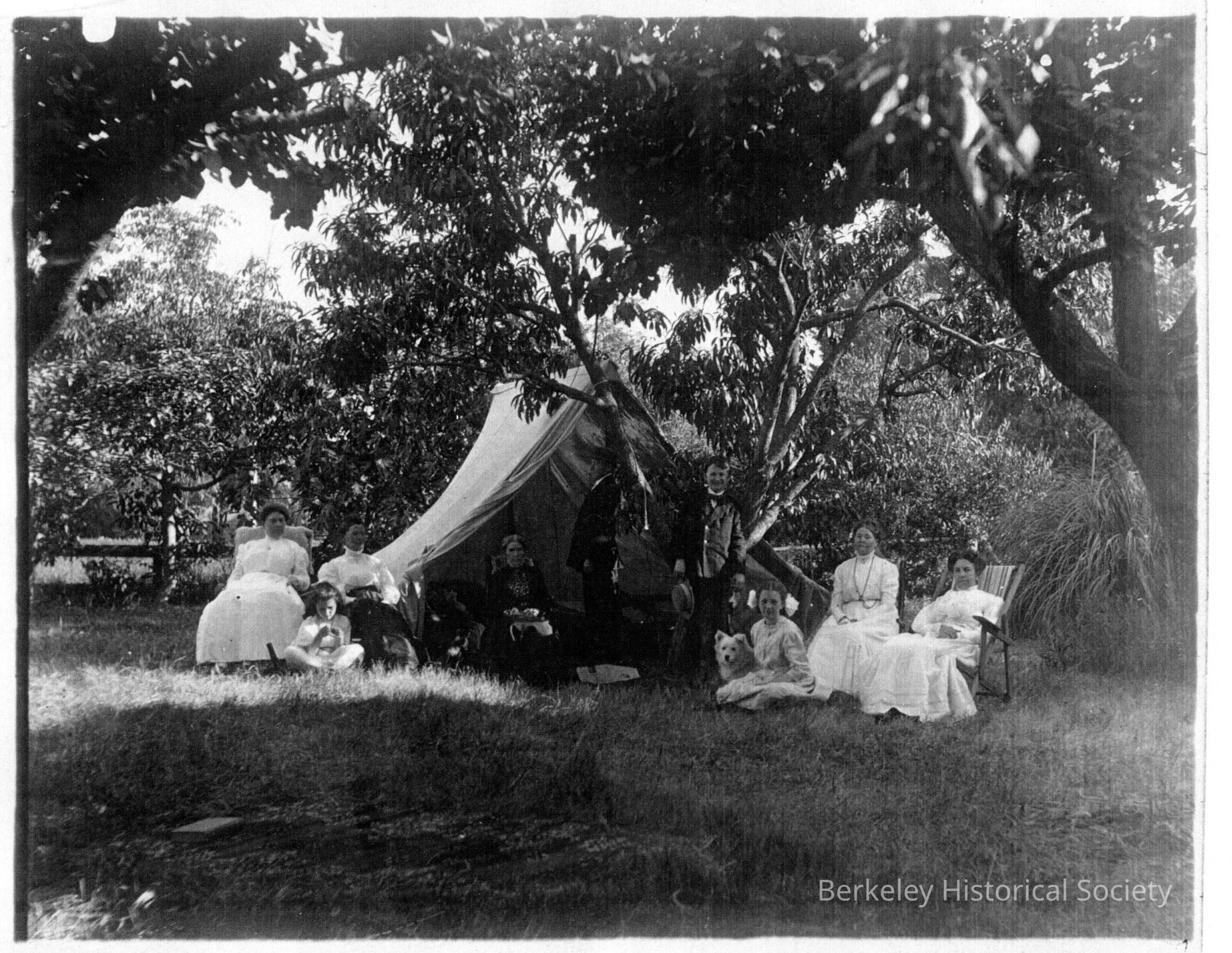 Family in orchard(?), women in white dresses, around tent among the trees. On back of photo: "2300 Durant Ave, Berkeley, Calif. 4th of July picnic. Cherry trees, apricot trees."Made/Created