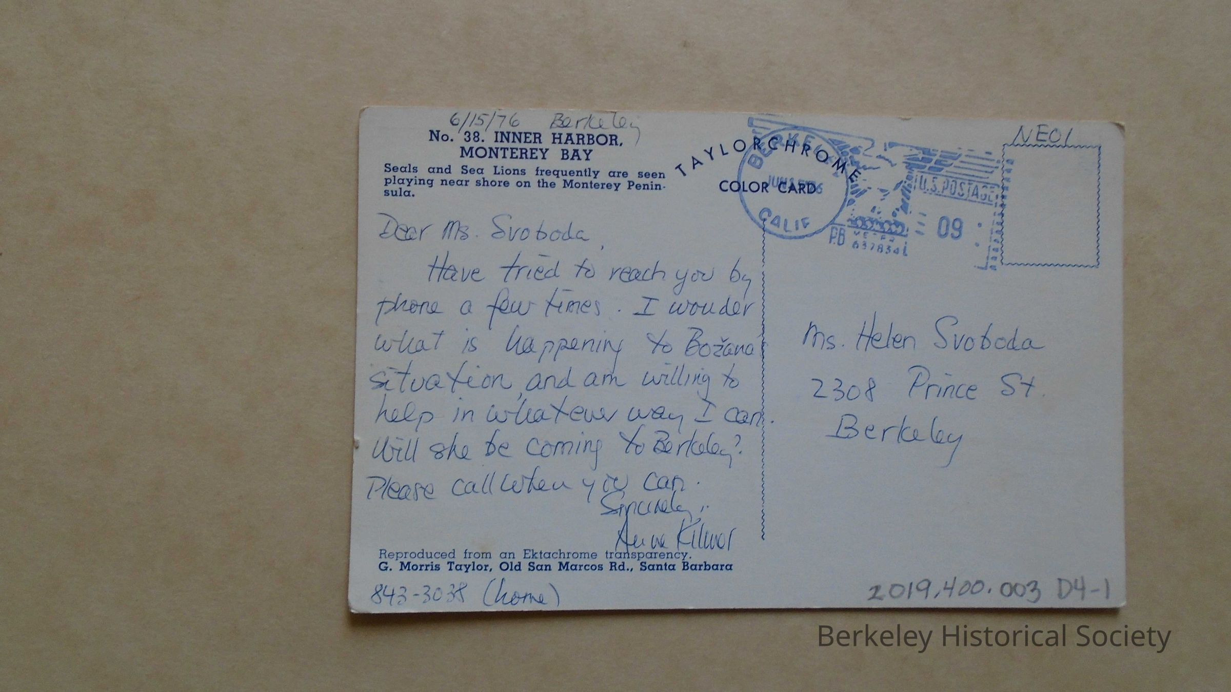 Picture postcard of Monterey Bay sent to Ms. Helen Svobeda, 2308 Prince St., Berkeley. Postmarked Berkeley, Calif, June 15, 1976. No postage stamp.