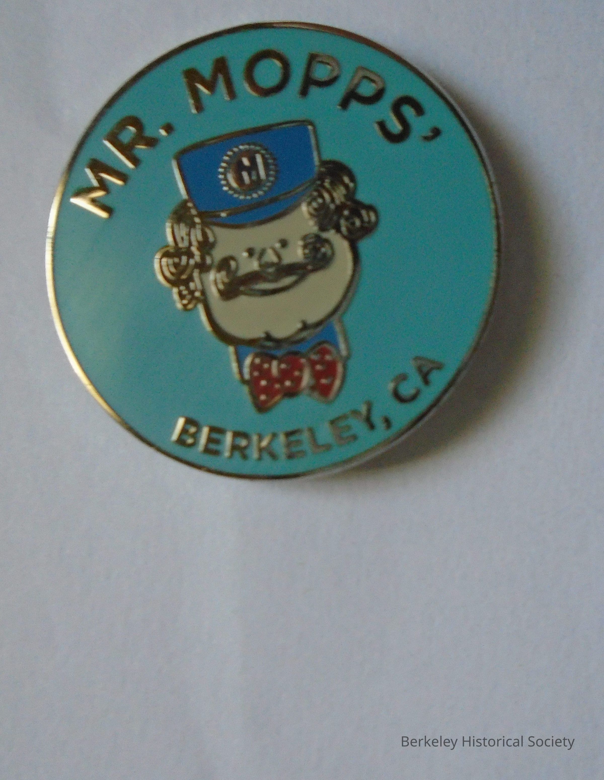 Mr. Mopps' Toy Shop metal pin, tie tack on back. Aqua enamel with blue, red and gold. Picture of head of Mr. Mopps. Store location: 1405 Martin Luther King Jr. Way. Since 1962.Made/Created