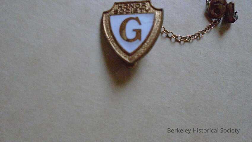 Garfield Jr. High School Honor Society pin. Gold and white shield shaped pin with a "G" in middle. Attached to it is a chain with a separate pin of the year "61".