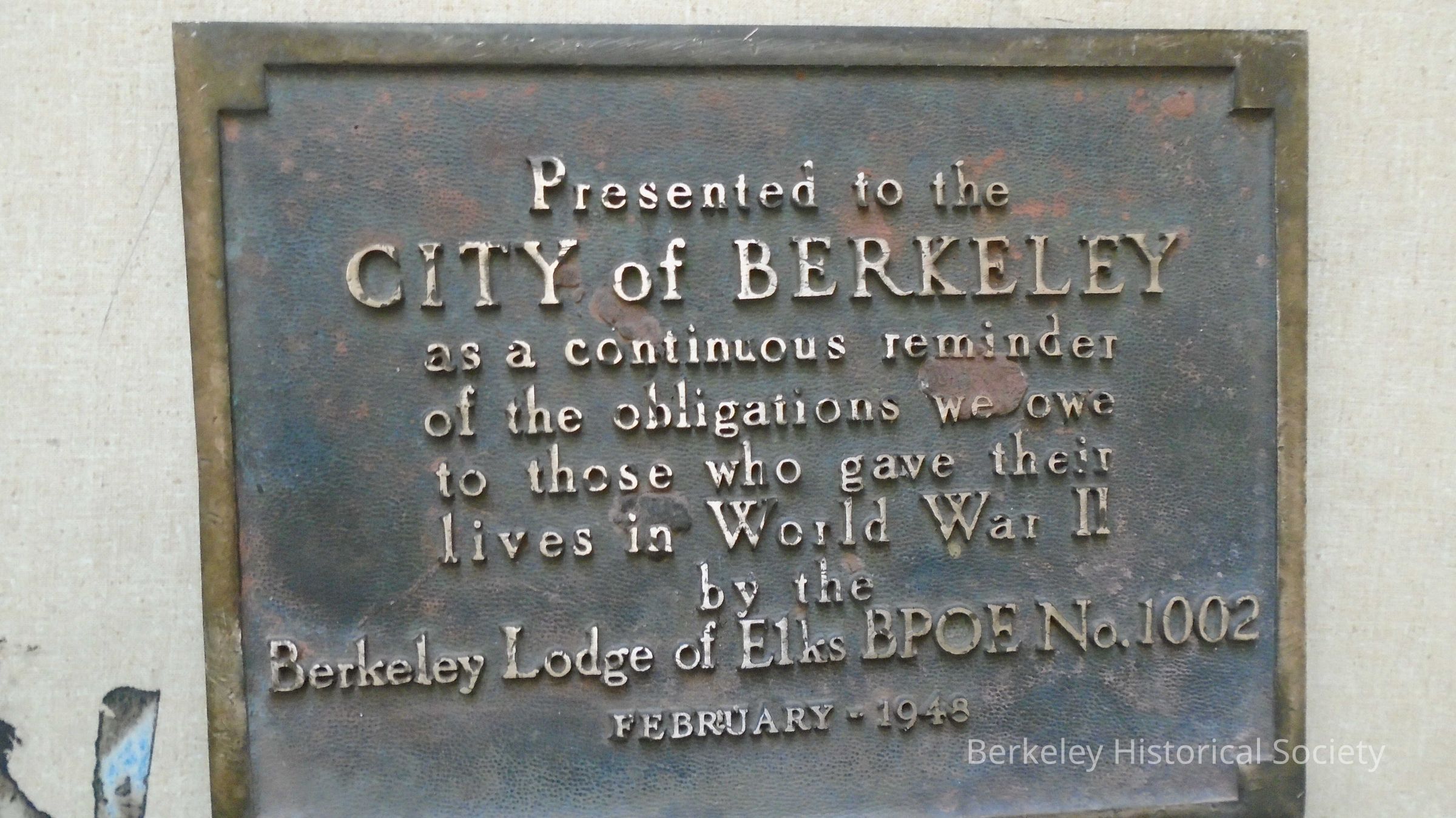 Heavy metal (brass) plaque: "Presented to the City of Berkeley by the Berkeley Lodge of Elks BPOE No. 1002 as a continuous reminder of the obligations we owe to those who gave their lives in World War II February 1948". Originally at the foot of a flagpole at Shattuck Ave., & Center St. and removed when the Berkeley Center Street Bart station was remodeled in 2016.