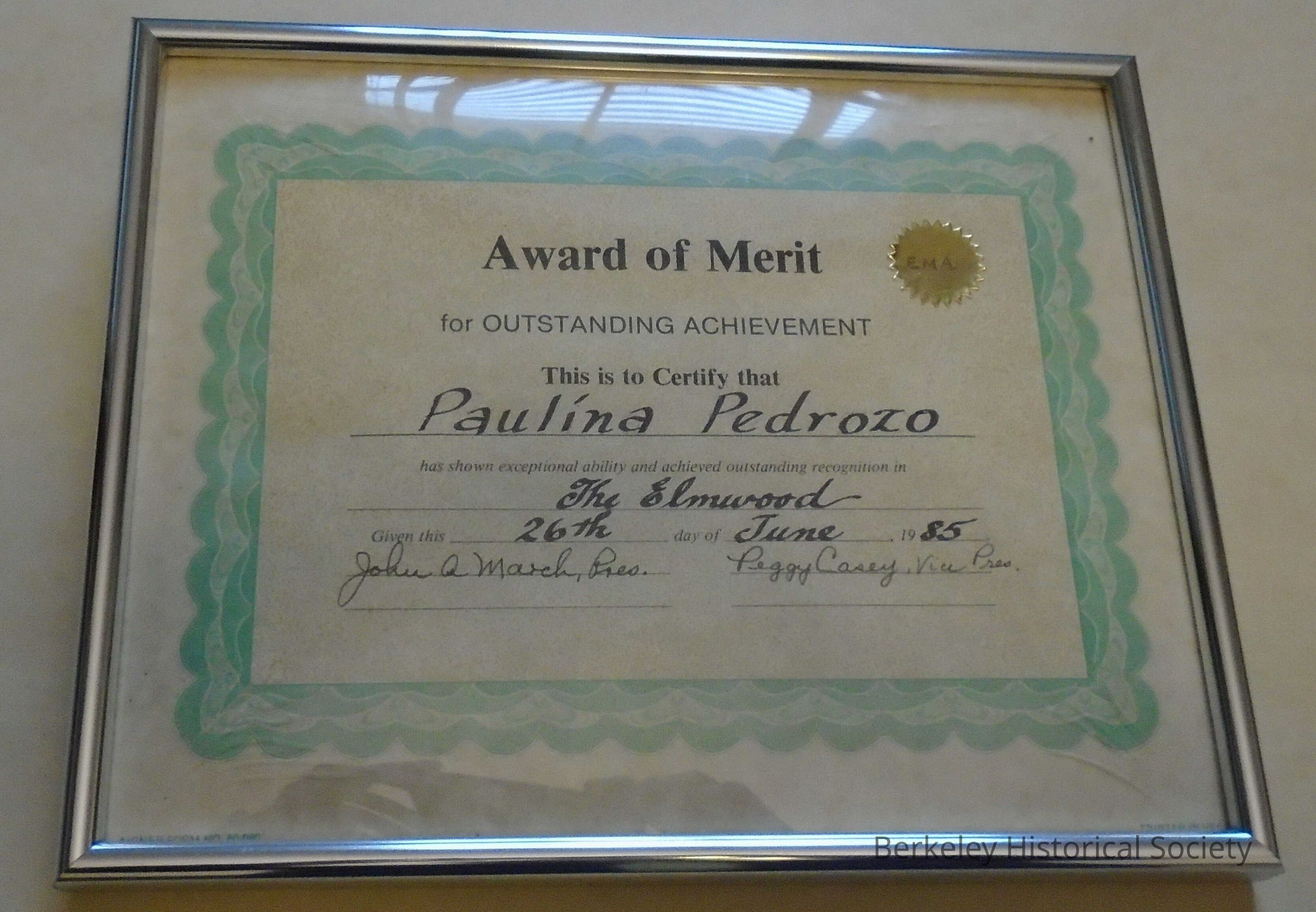 Metal and plastic framed "Award of Merit for Outstanding Achievement". Additional text reads "This is to certify that Paulina Pedrozo has shown exceptional ability and achieved outstanding recognition in The Elmwood". Frame is silver colored metal with clear plastic in front and cardboard backing. Award is parchment colored paper with green trim around the edge, black text and has a gold seal in the upper right corner with the letters E.M.A. in the center. Award is dated June 26, 1985 and signed by John A. March, Pres. and Peggy Casey, Vice Pres.Made/Created