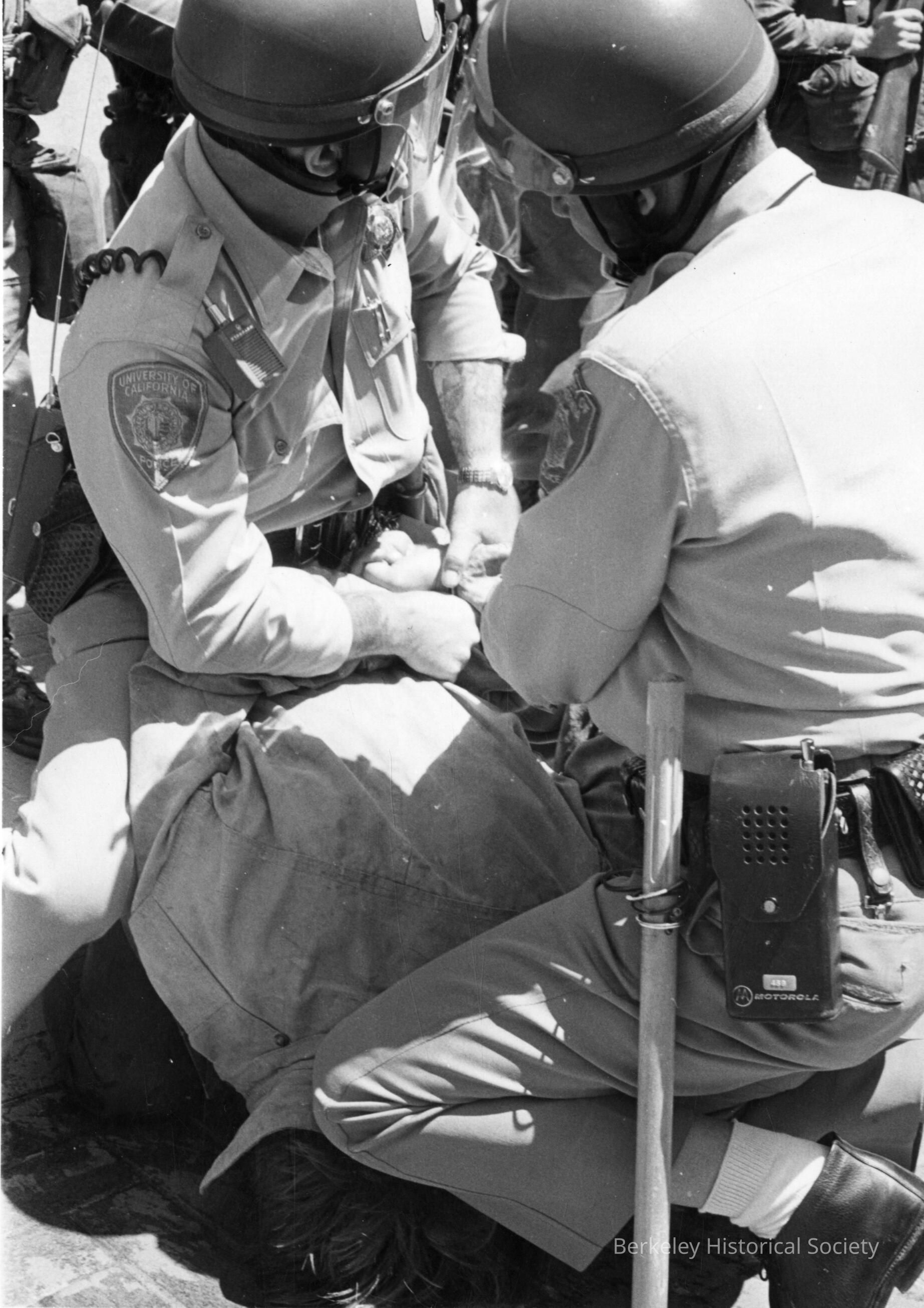 Police holding down rioter on Telegraph Avenue