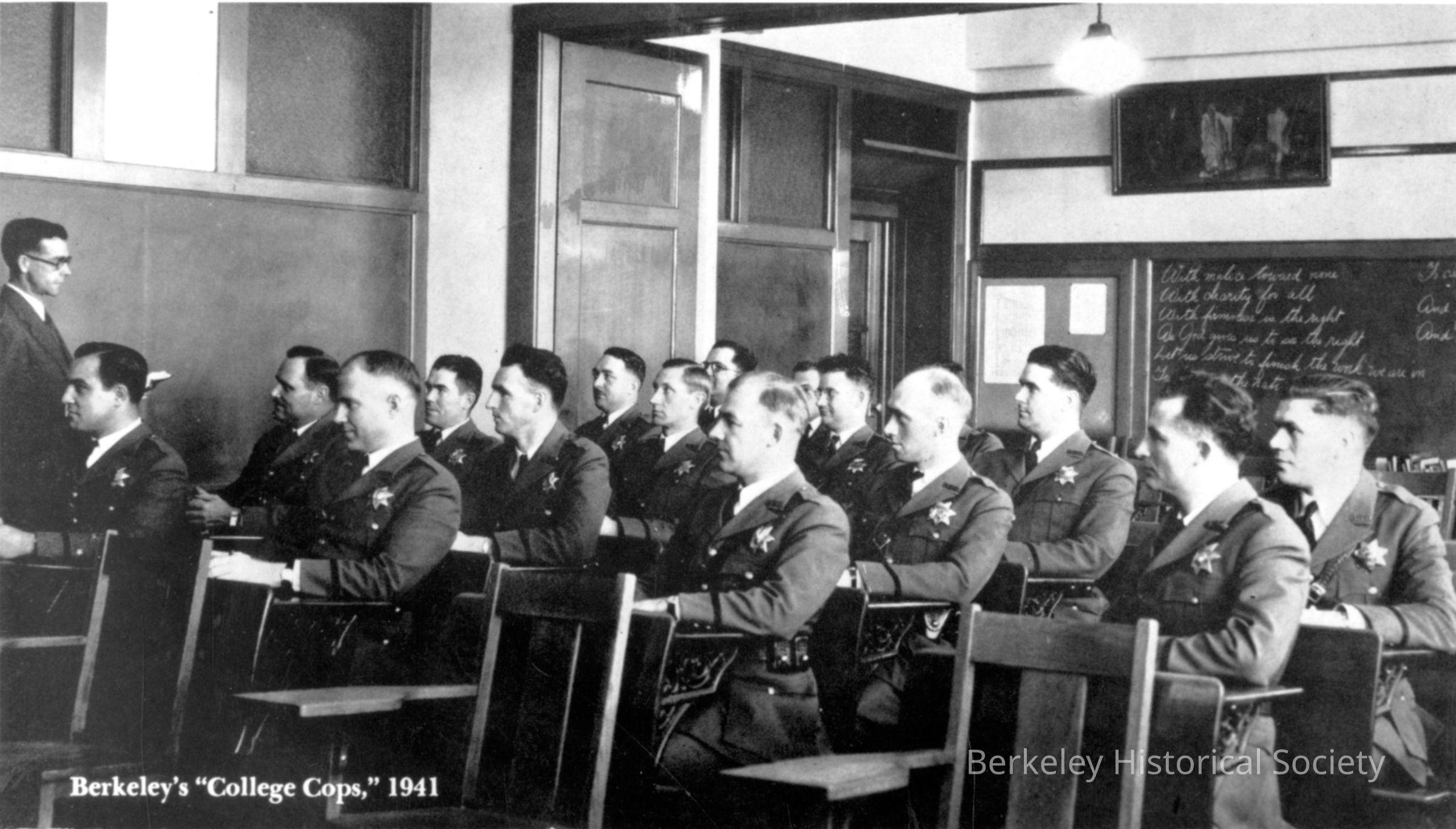 Officers seated at desks in classroom. At bottom of photo: Berkeley's College Cops, 1941Other Names and Numbers
