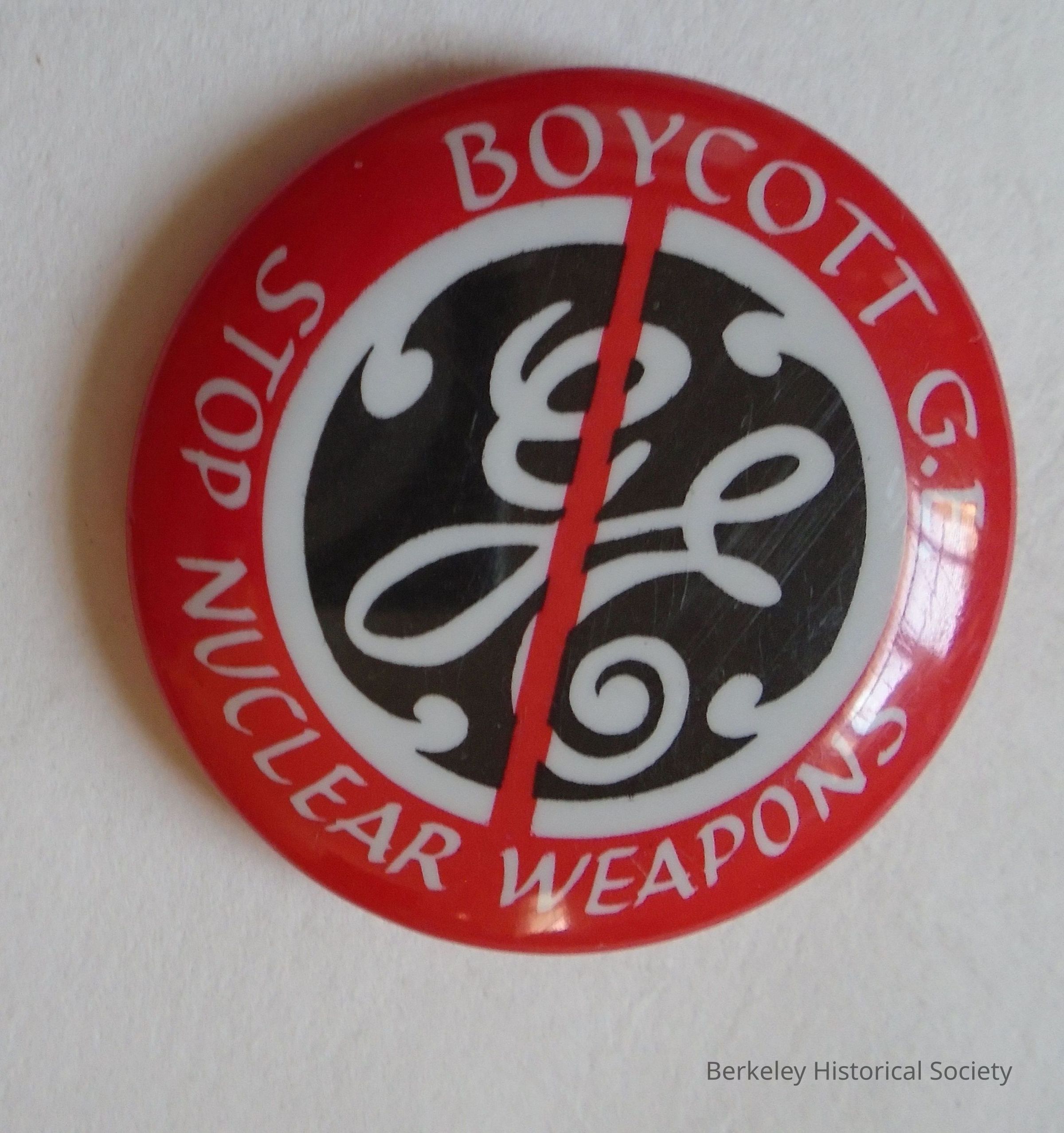 Round metal button, red, white and black. Logo of G.E. in the middle with a line through it with "Boycott G.E. Stop nuclear weapons".