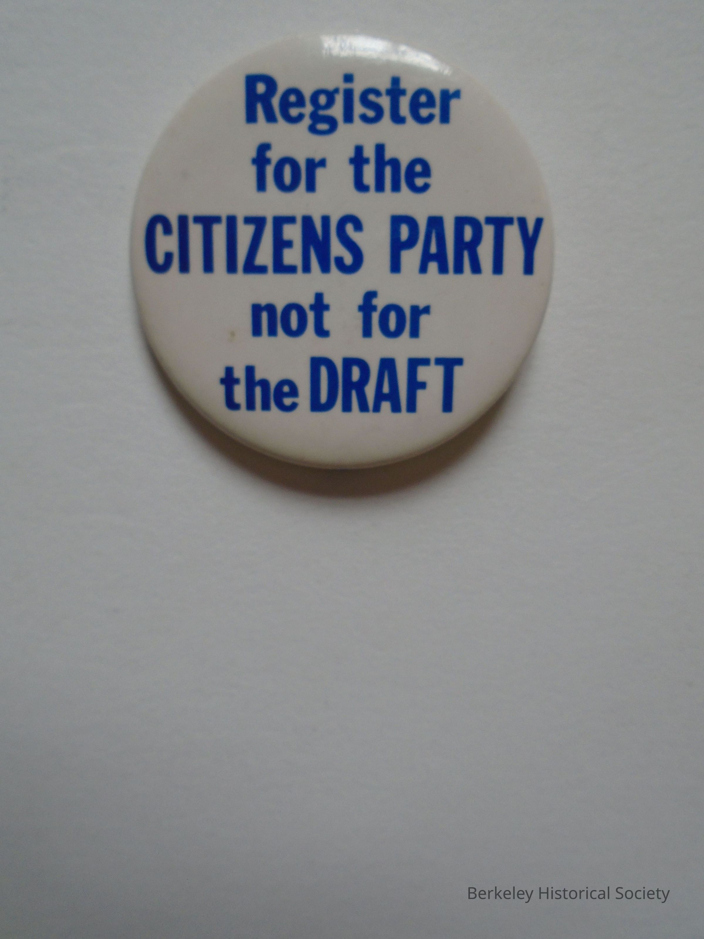 Round metal button with pin on back, white and blue "Register for the Citizens Party not for the DRAFT" on the front.