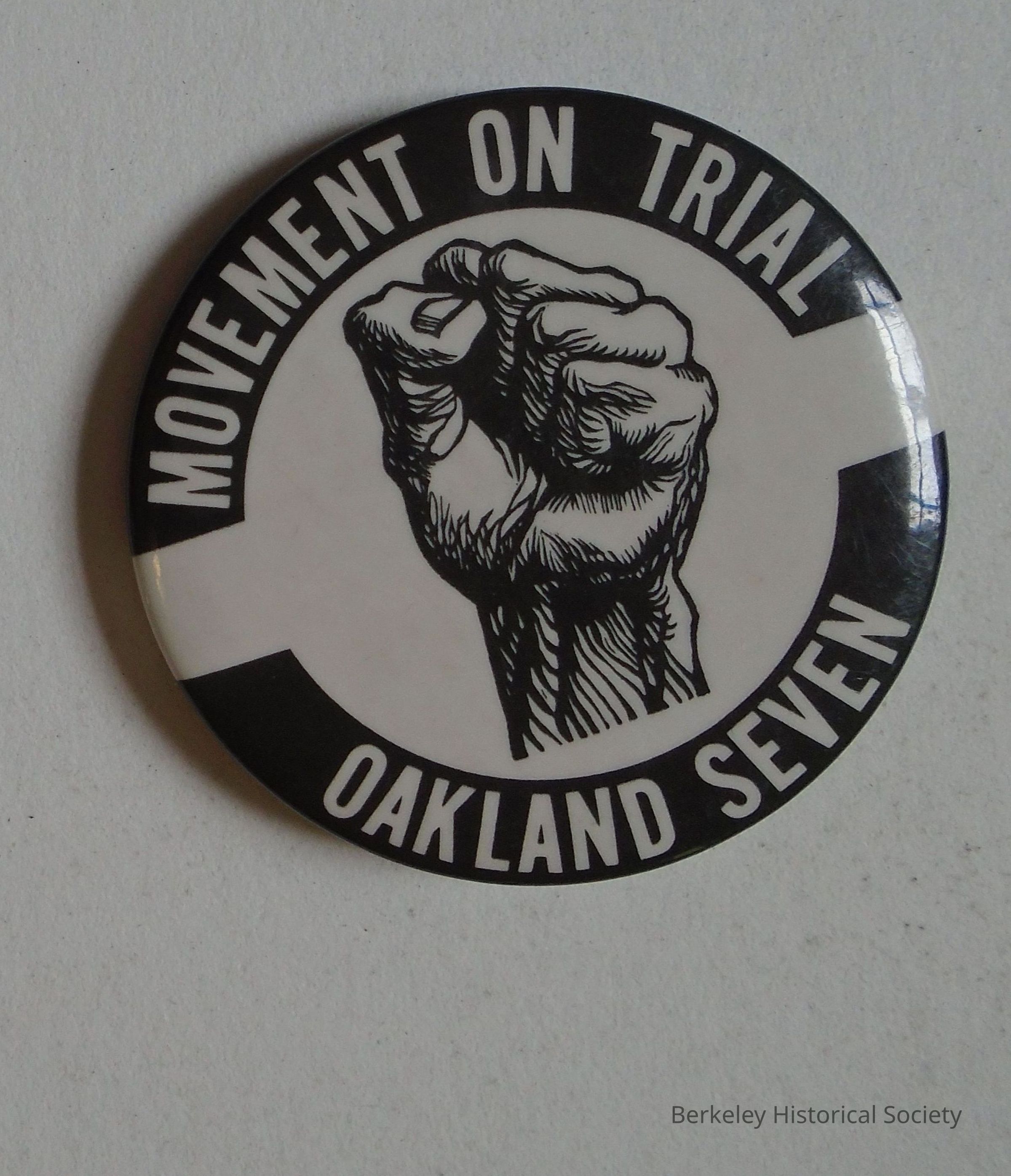 Round metal button , black and white, with clenched fist in middle and "Movement on Trial Oakland Seven". The seven were SF Bay area ant-vietnam war activists, working on the anti draft movement of 1967-8. They were acquitted in 1969.