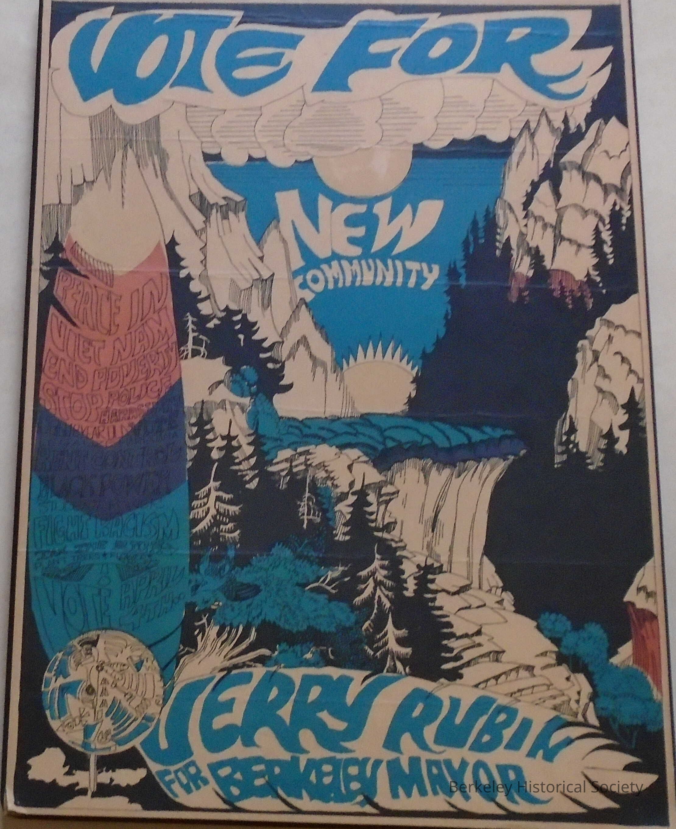 Political poster, paper mounted on particleboard: "Vote For Jerry Rubin for Berkeley Mayor, New Community". Blue, black, white and pink drawing of waterfall, mountains, fir trees, rising sun. NW Indian pictographs/symbols on left side with "Peace in Vietnam, End Poverty, Stop Police Harassment, Black Power, Vote April 4th (etc.)".Lexicon