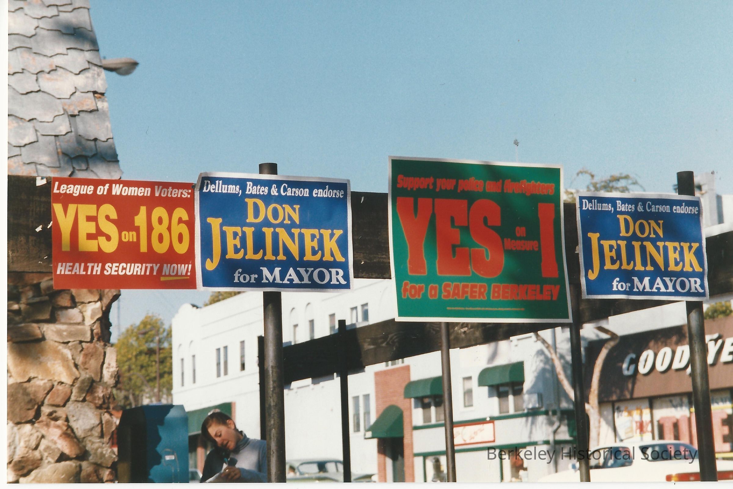 Signs for Don Jelinek for mayor, Yes on I, and Yes on 186. Color snapshot.Made/Created