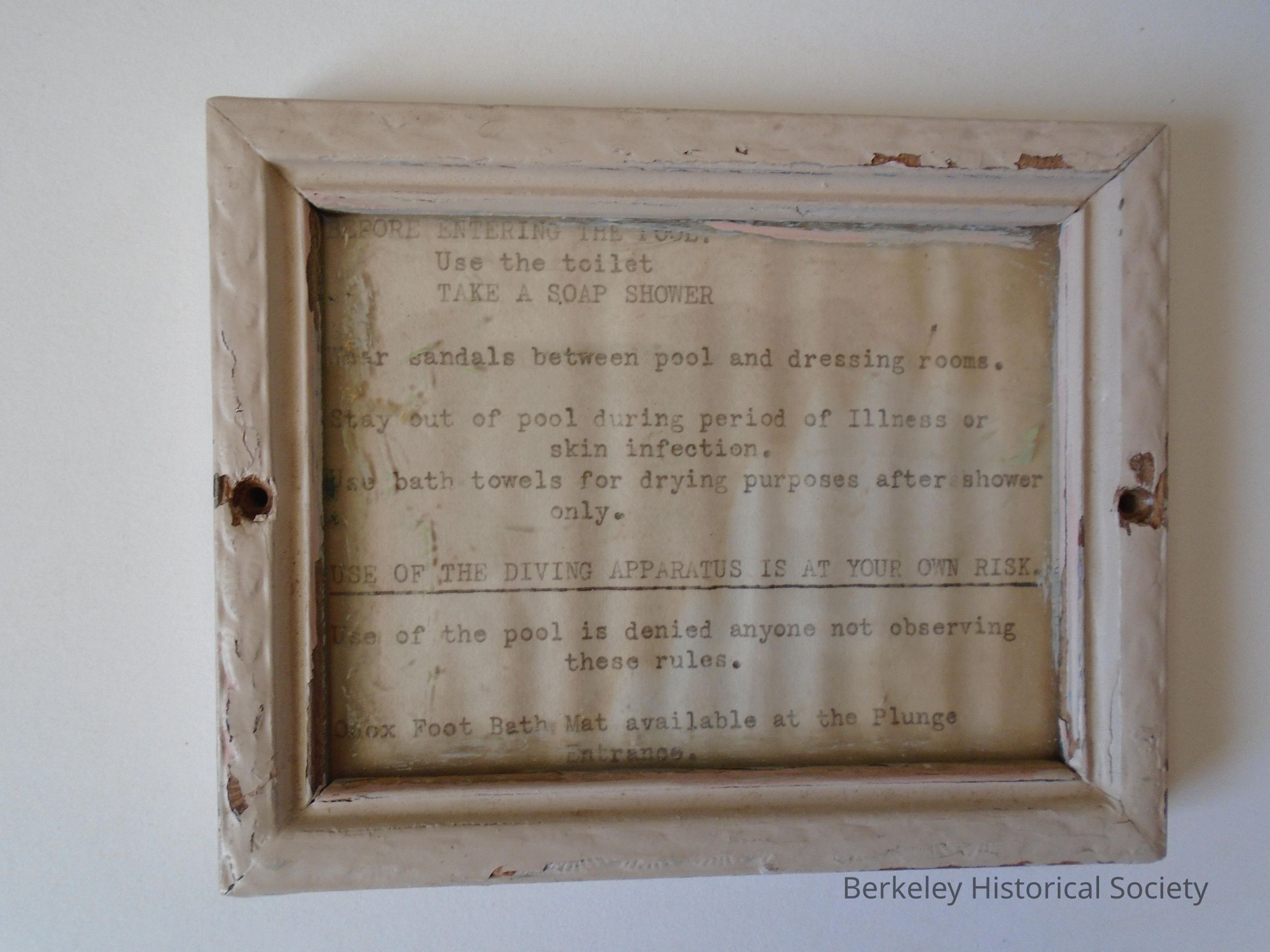 Instructions, typed (on paper) and framed in a wood frame for "before entering the pool".Made/Created