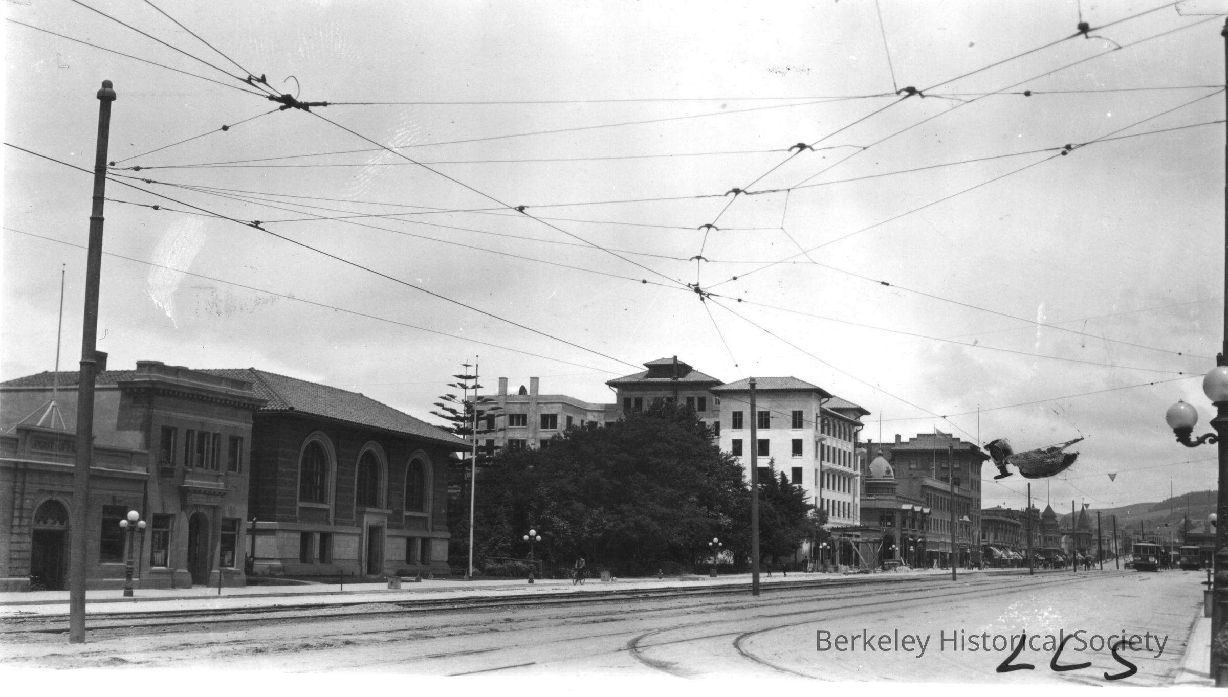 Post Office, home savings, Carnegie Library, first unit Shattuck Hotel 1909. View north from Bancroft Way.